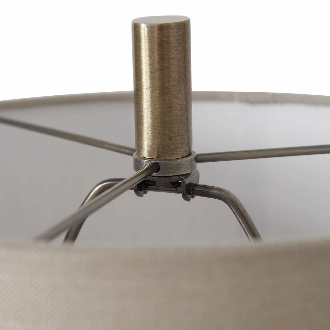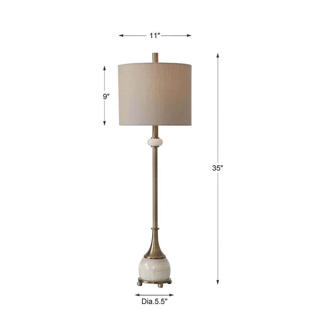 This buffet lamp features a delicate design with traditional elements that showcase polished white marble details, paired with antique brass plated accents. The round hardback shade is a warm khaki linen fabric.