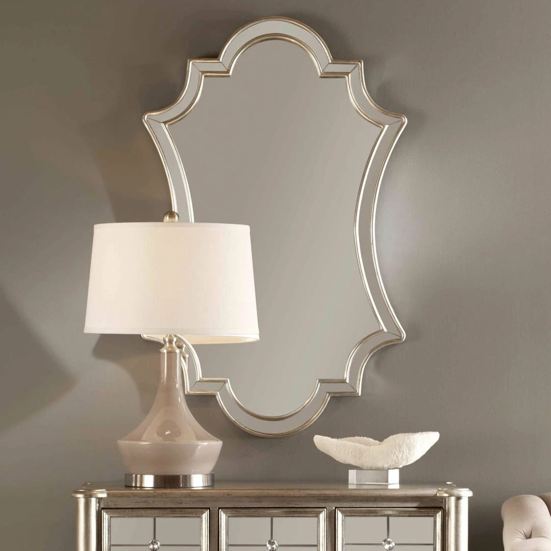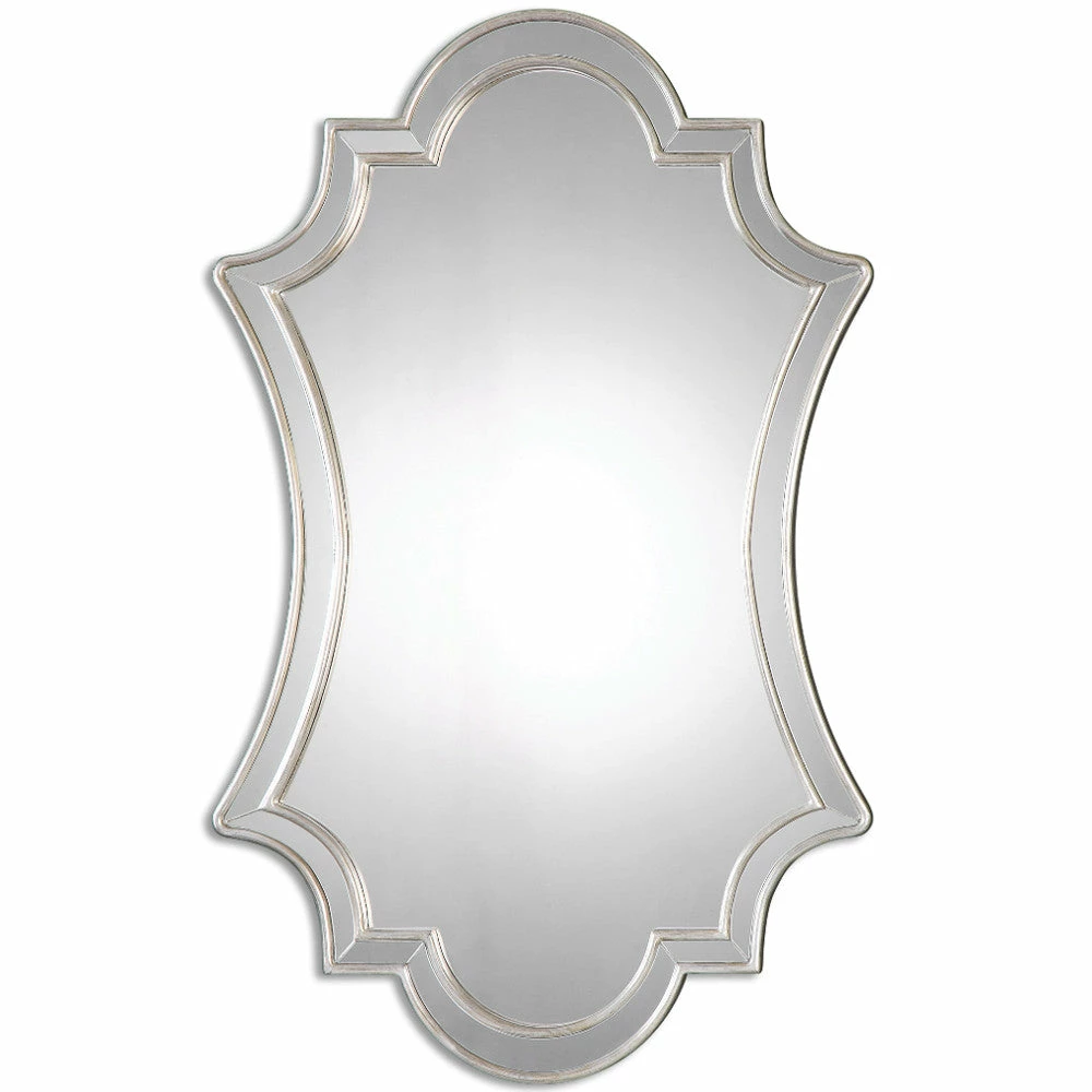 Gracefully curved polished edged mirror facets encased in a lightly antiqued silver leafed frame.