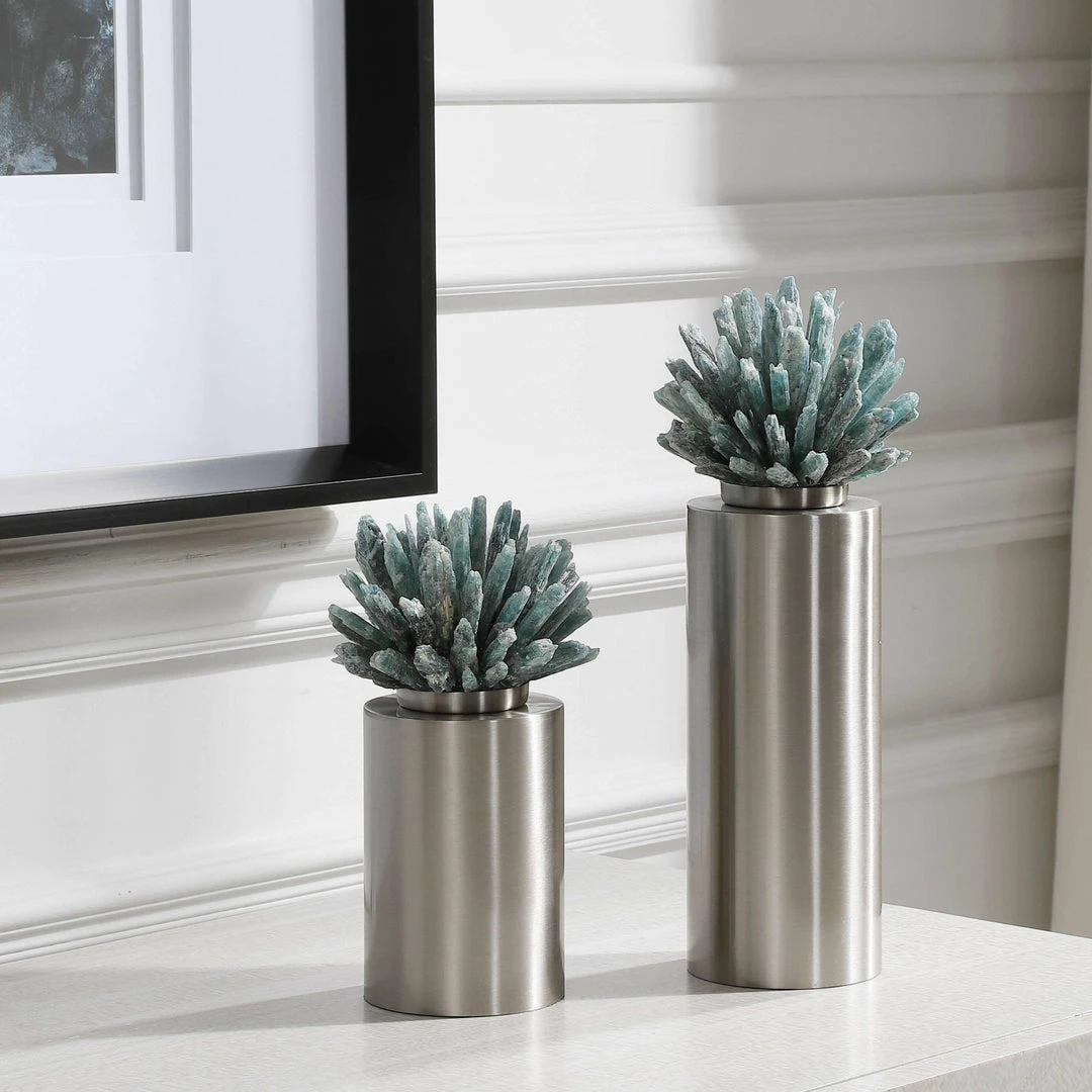 Perfect for styling a bath or bookshelf, this contemporary set showcases vibrant aqua selenite florets atop solid iron columns finished in brushed nickel.