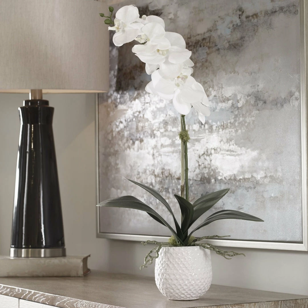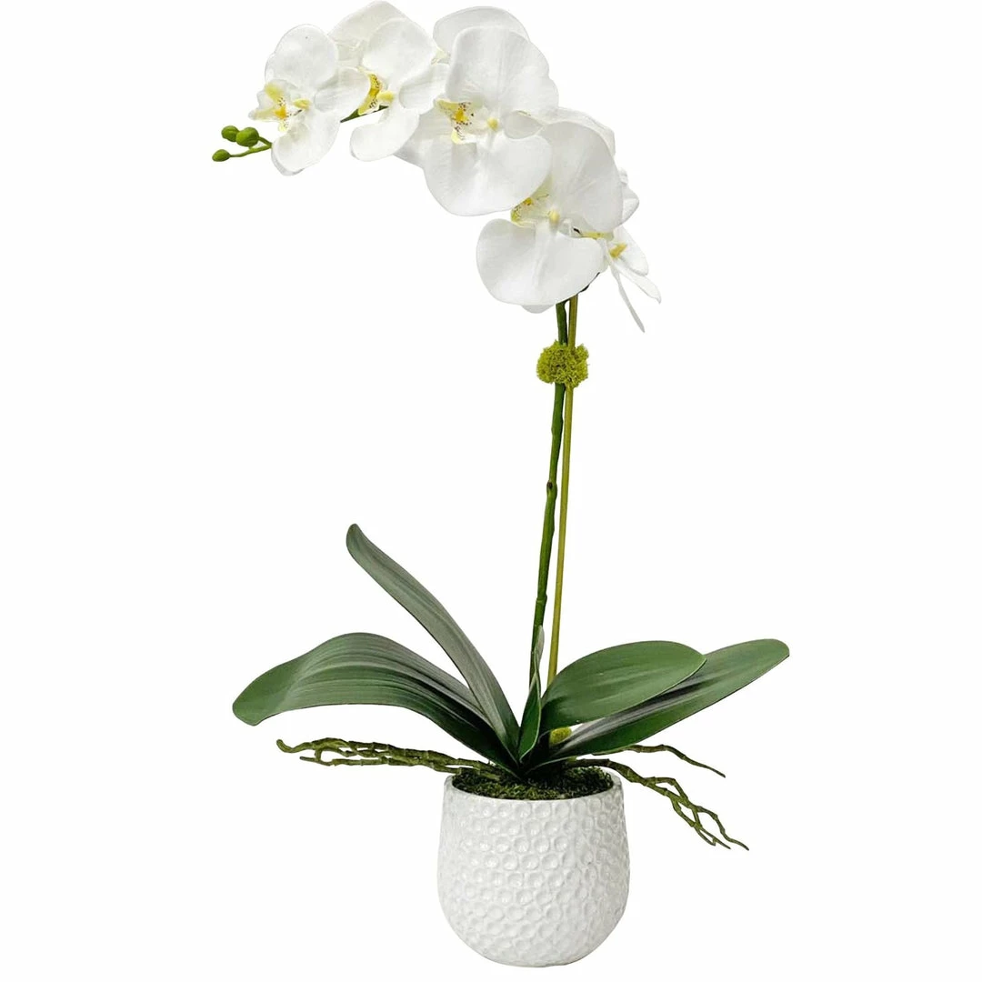 A gracefully arching stem of white orchids with reindeer moss accents over a bed of naturally preserved moss, placed in a contemporary textured white ceramic pot.