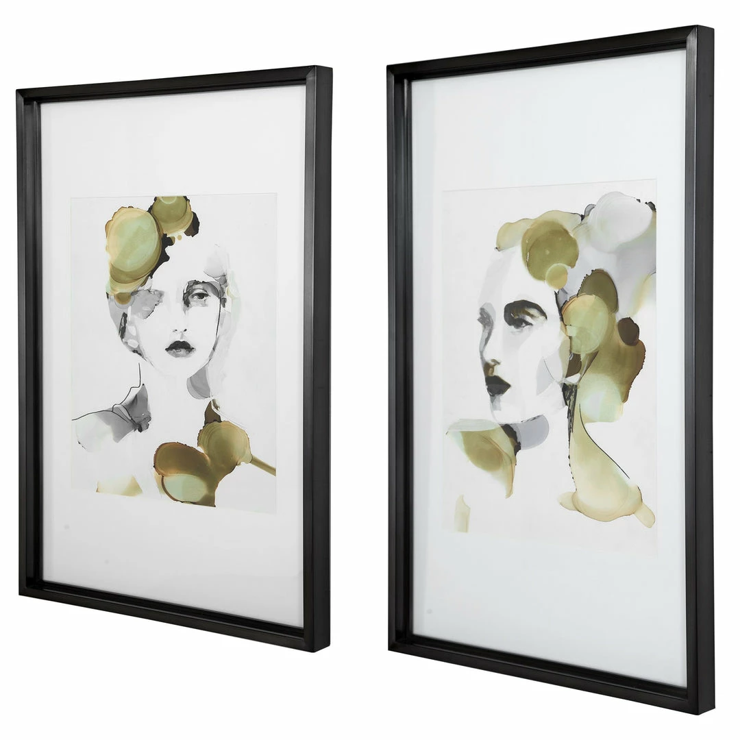Set of two modern, statement art pieces showcase watercolor style portraits with shades of sage green, sepia, and charcoal. Each print is accented by a simple white mat with a matte black frame and is placed under glass.