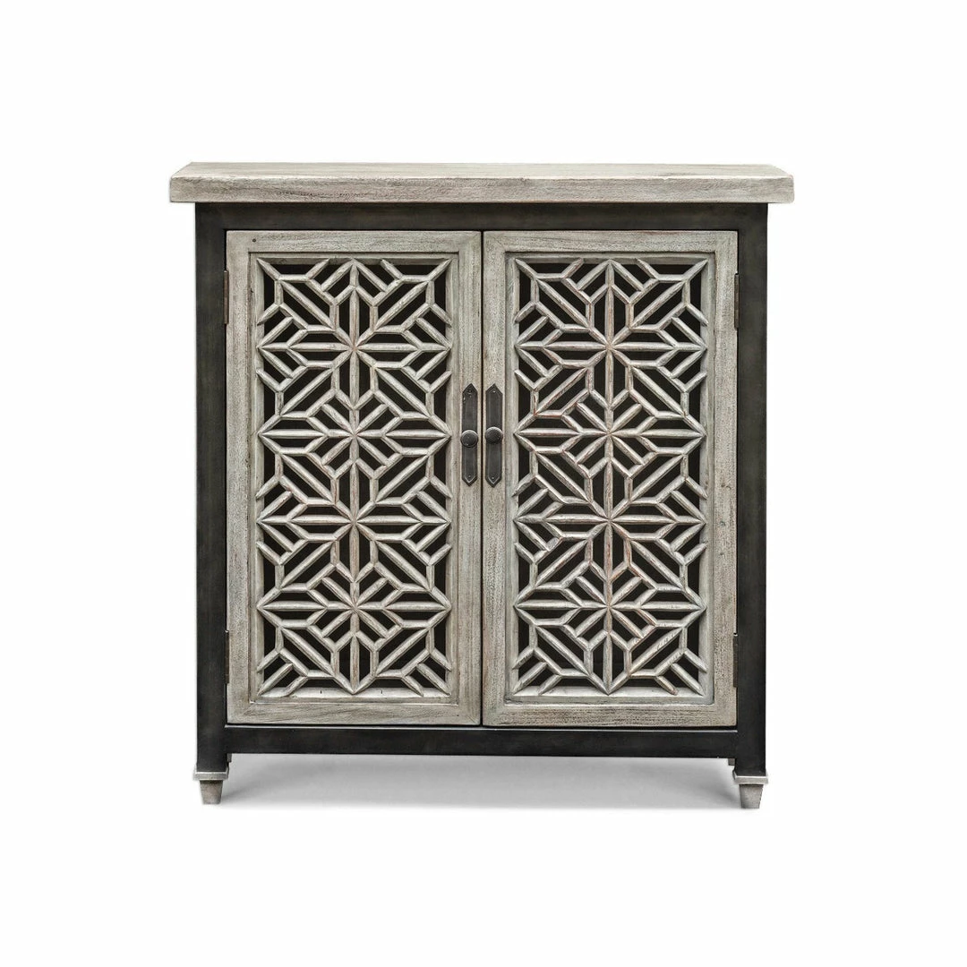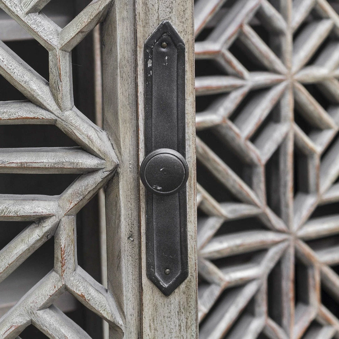 Beautifully carved open fret doors, in aged white mahogany wood with a light gray wash, framed with iron in a worn industrial finish. Two fixed interior shelves.