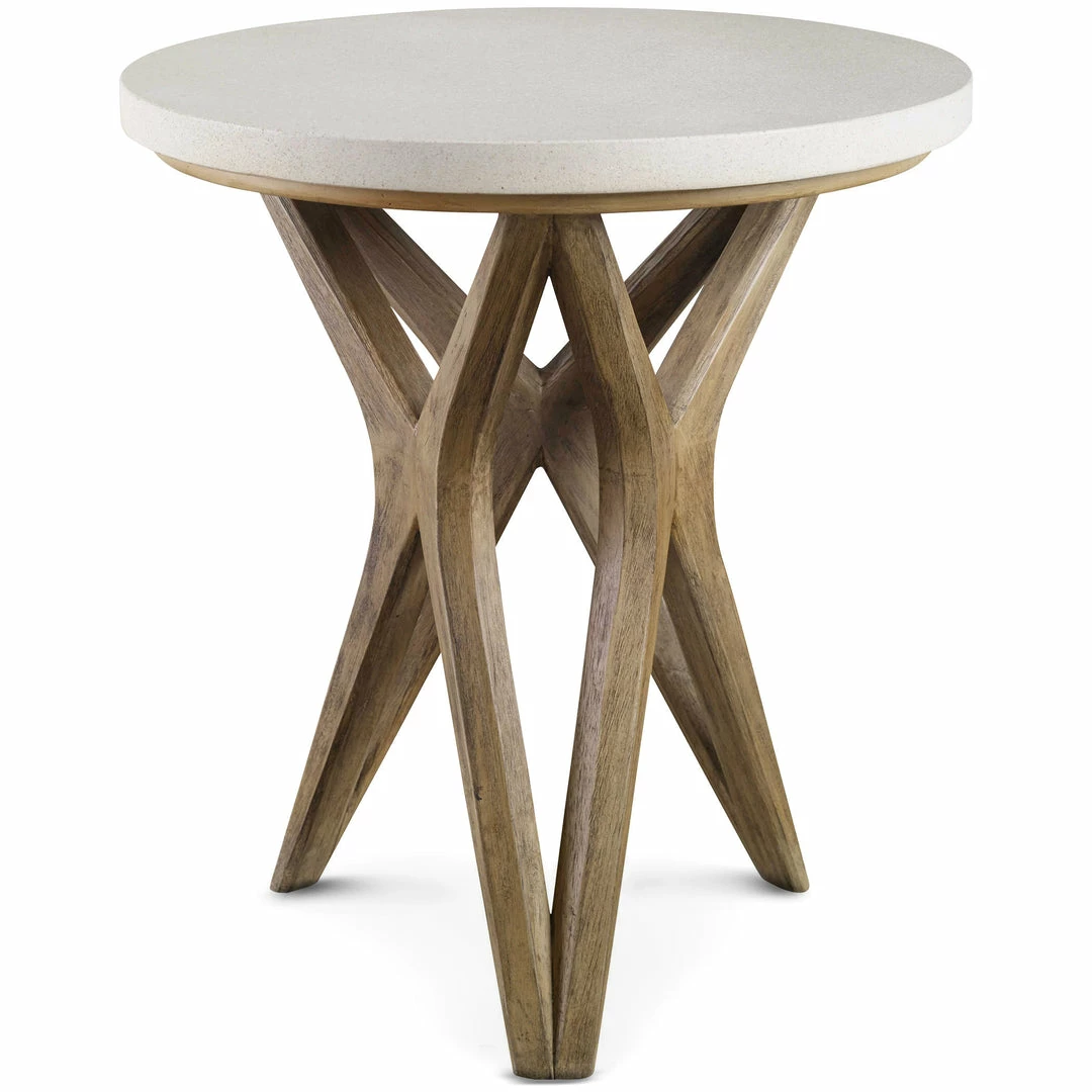 The Phoenix accent table is handcrafted from solid mixed woods with an natural ivory limestone top. The geometric base is finished in a warm rustic wash.