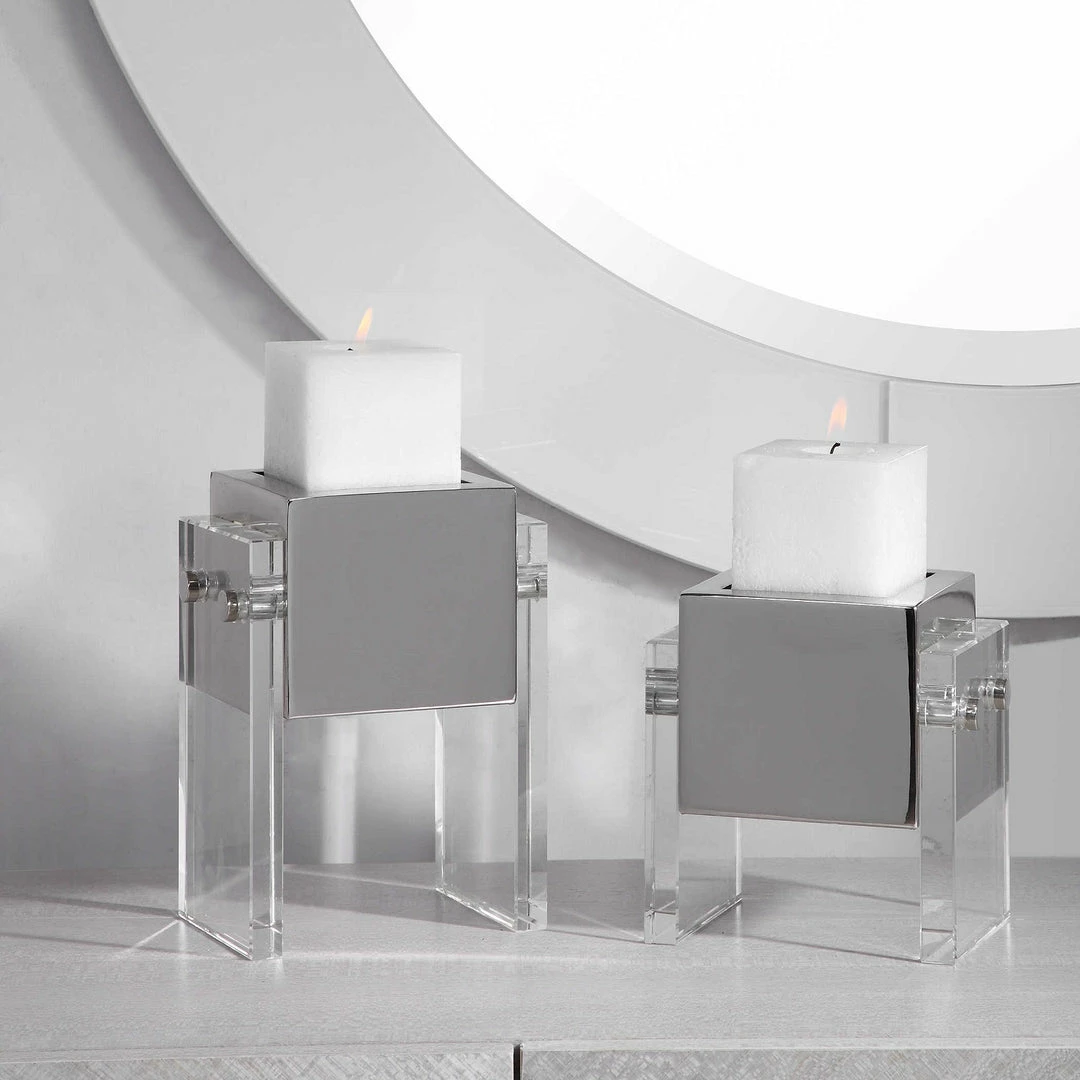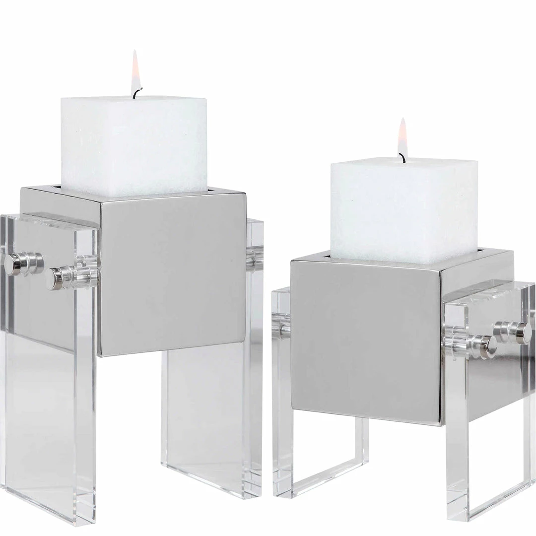 Set of two crystal and polished nickel candleholders.