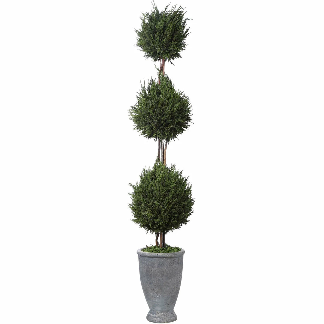 Wispy sprays of cypress foliage, preserved while freshly picked to maintain the life-like evergreen quality, set into an aged gray finished terracotta pot.