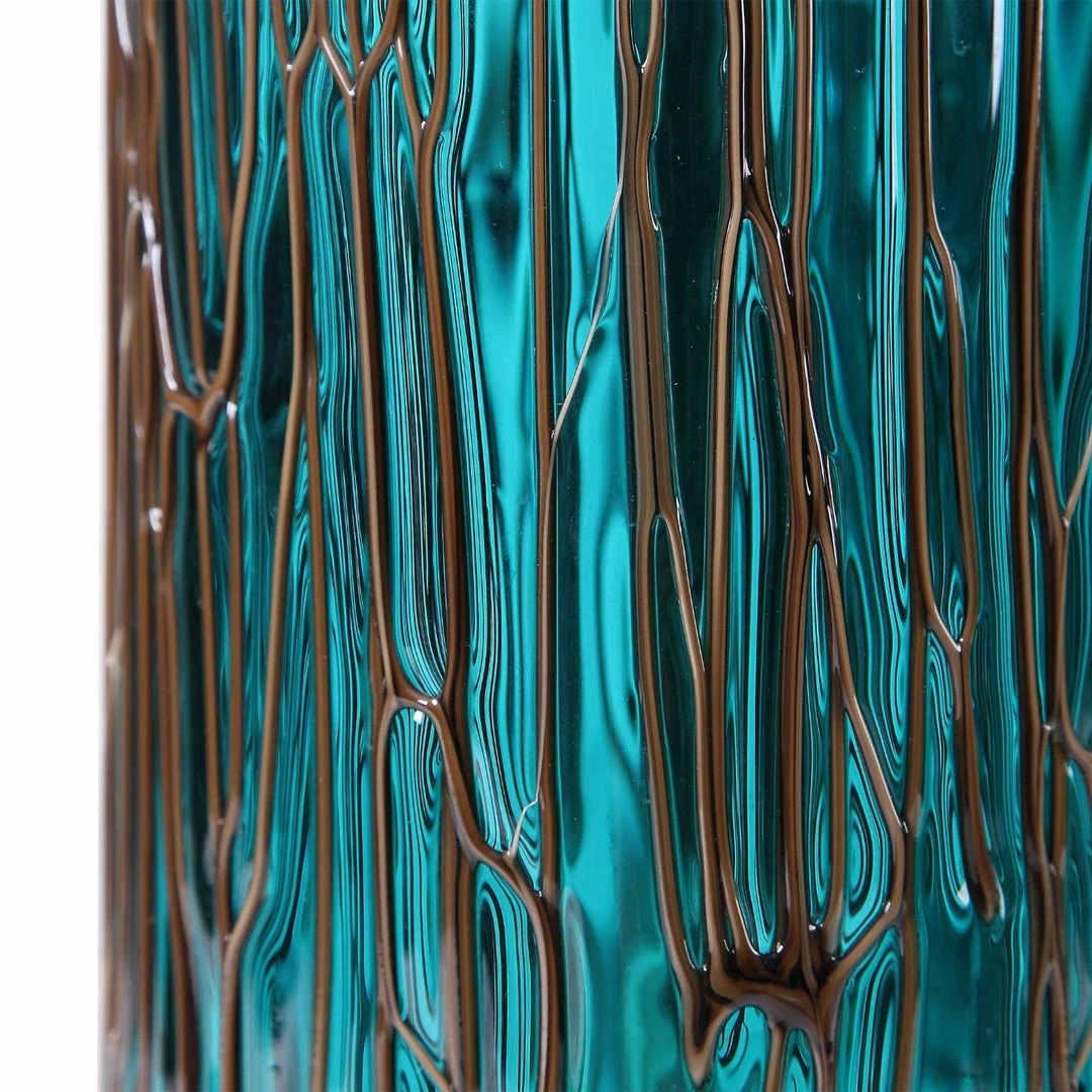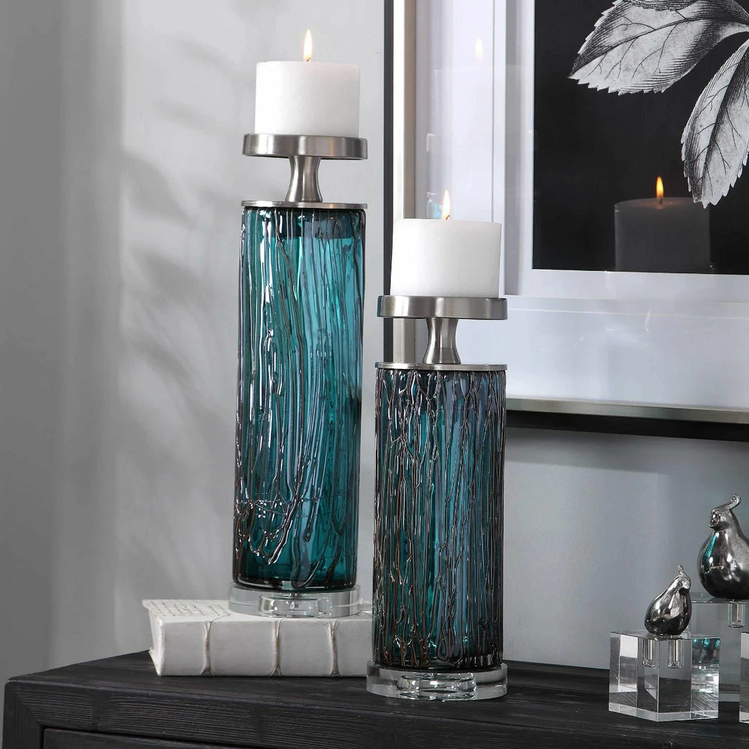Set of two candle holders feature teal glass base with bronze sugar spun accents and brushed nickel and crystal details.