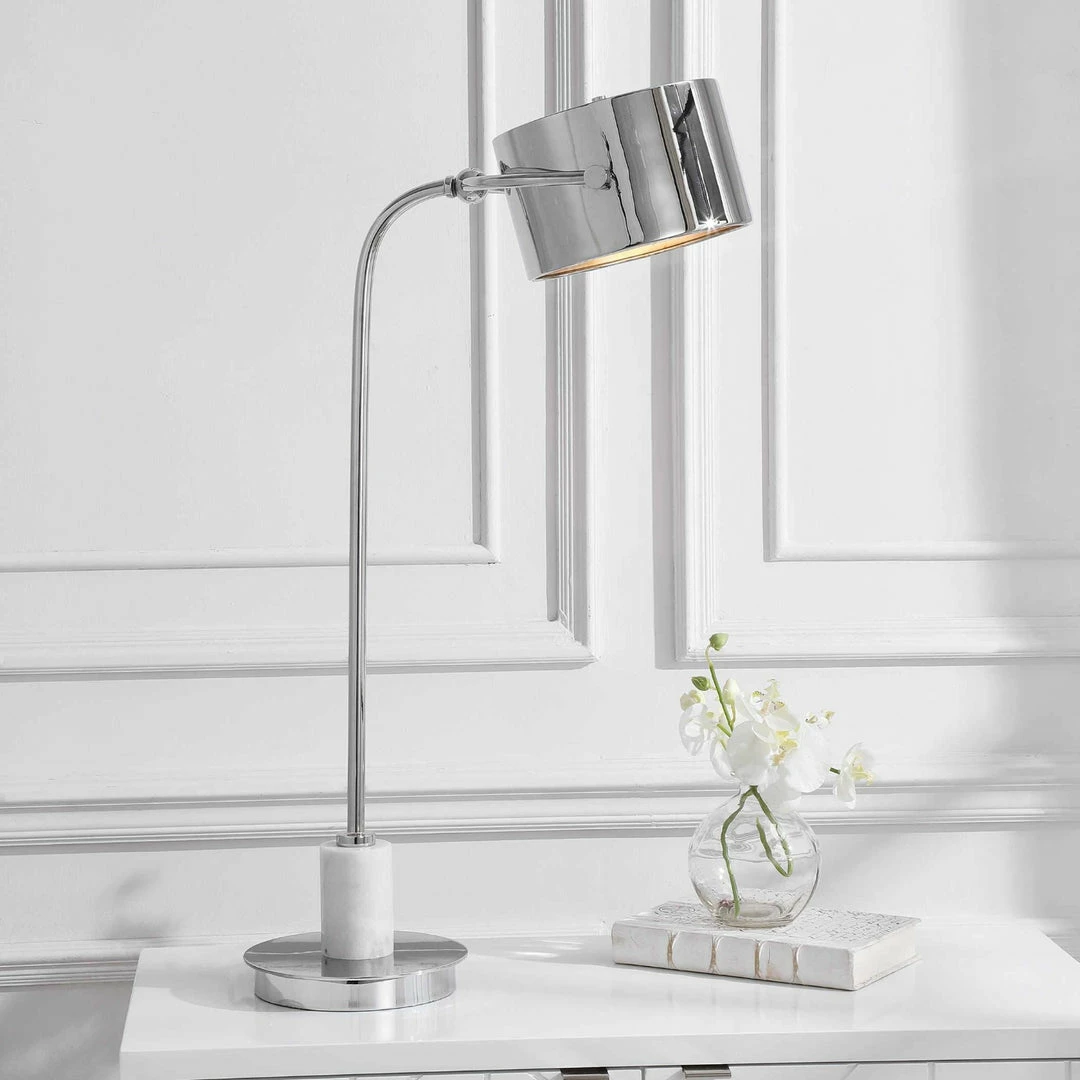 Contemporary desk lamp features a solid steel construction that’s finished in a sleek polished nickel plating with a matching metal shade, accented with a white marble collar.