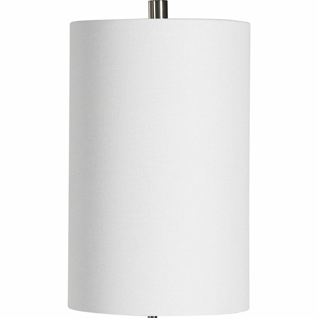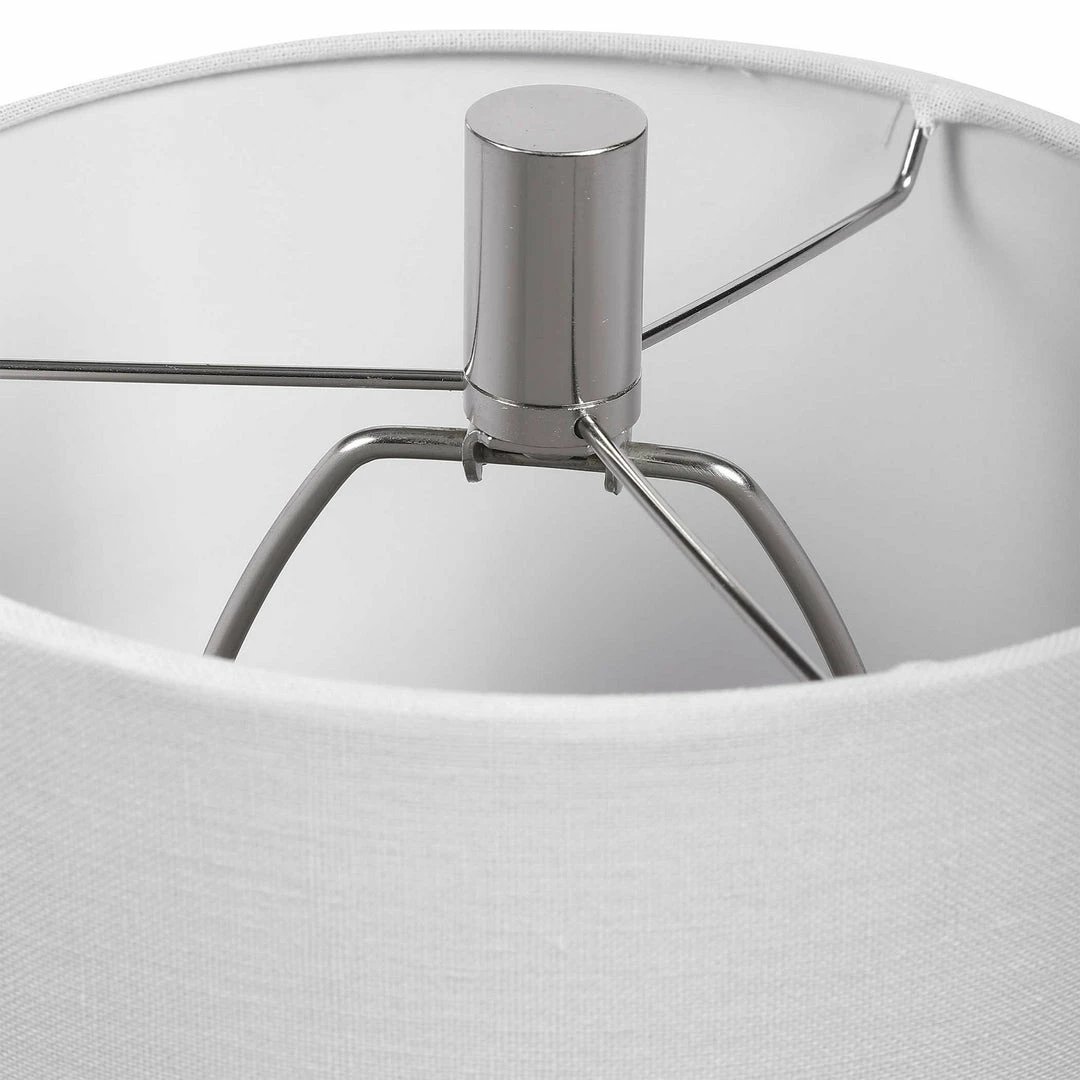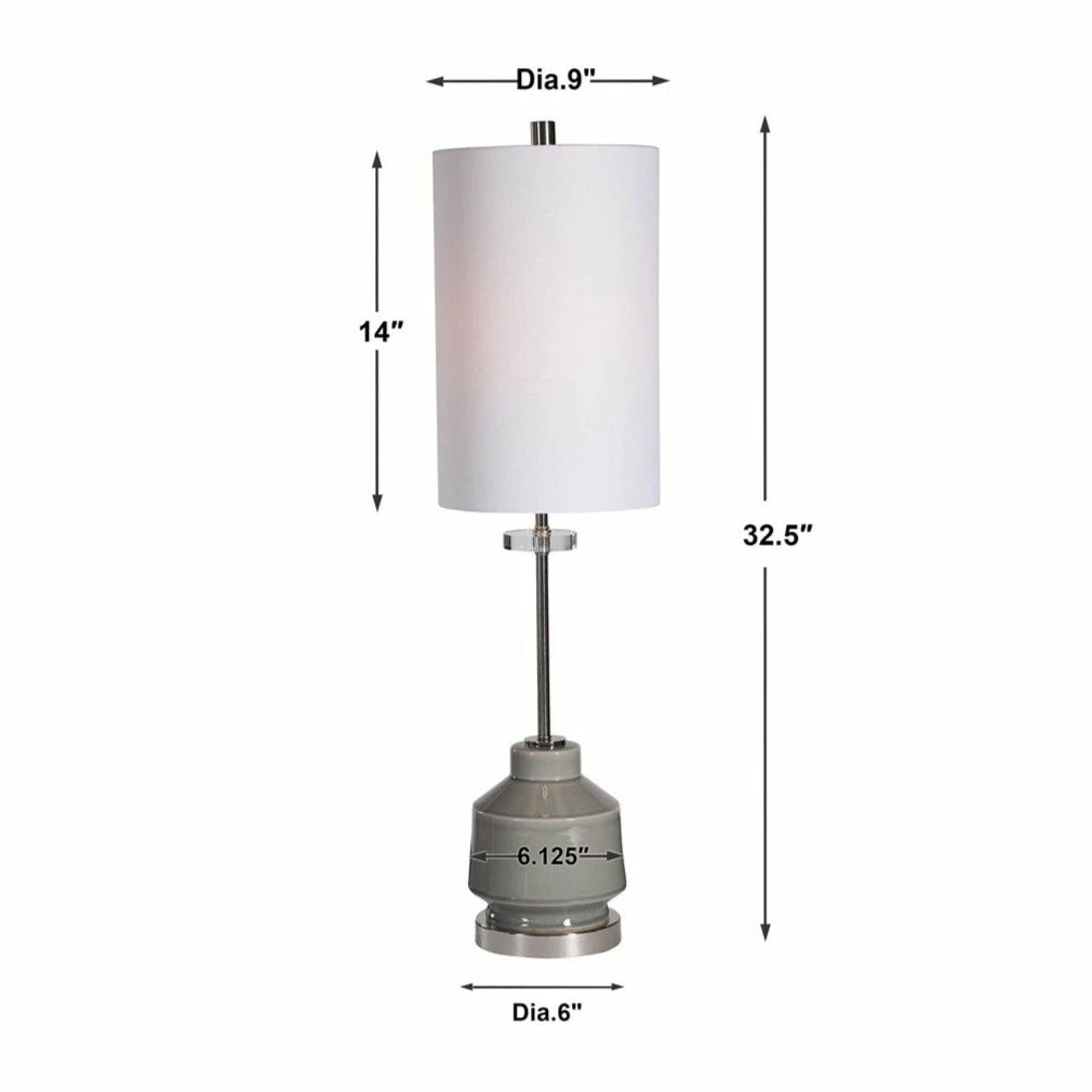 This elegant buffet lamp features a clean geometric shaped ceramic base finished in a warm gray glaze, accented by polished nickel plated iron details and crystal accents. The lamp is complimented by a white linen fabric shade.