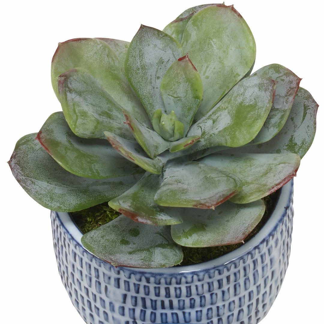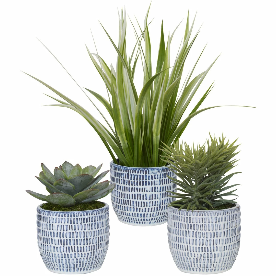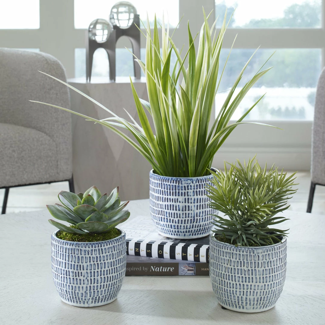 Succulent and spider plant trio accented by naturally preserved moss in hand carved blue and white ceramic planters.