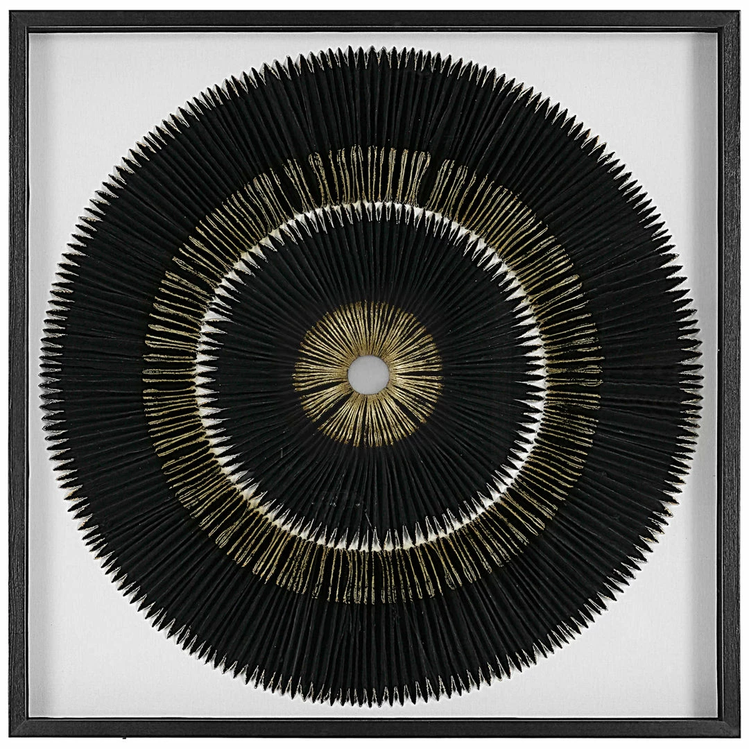 Handcrafted by skilled artisans, this wall decor features a striking black and gold leaf medallion. Artwork is set against a white linen backing in a black shadowbox style pine wood frame under glass.
