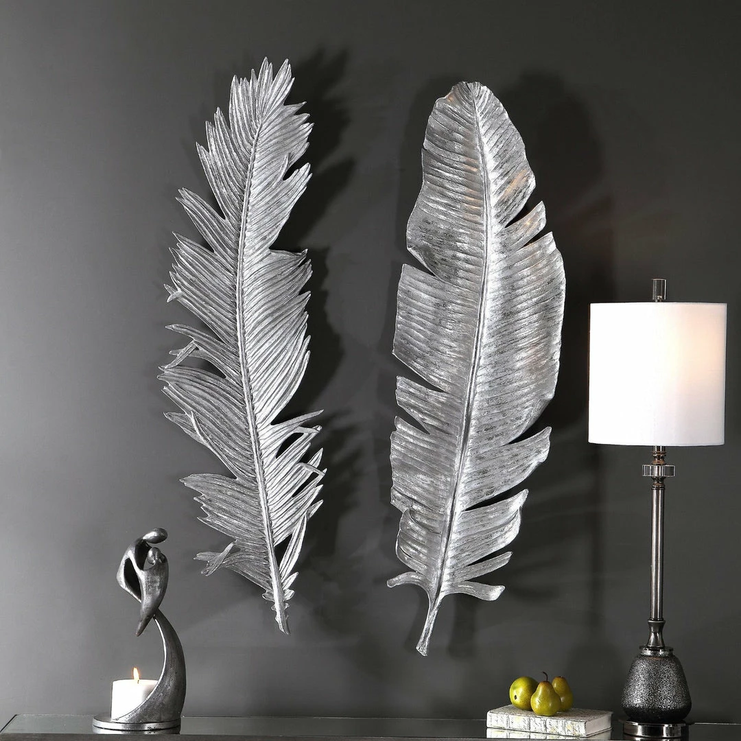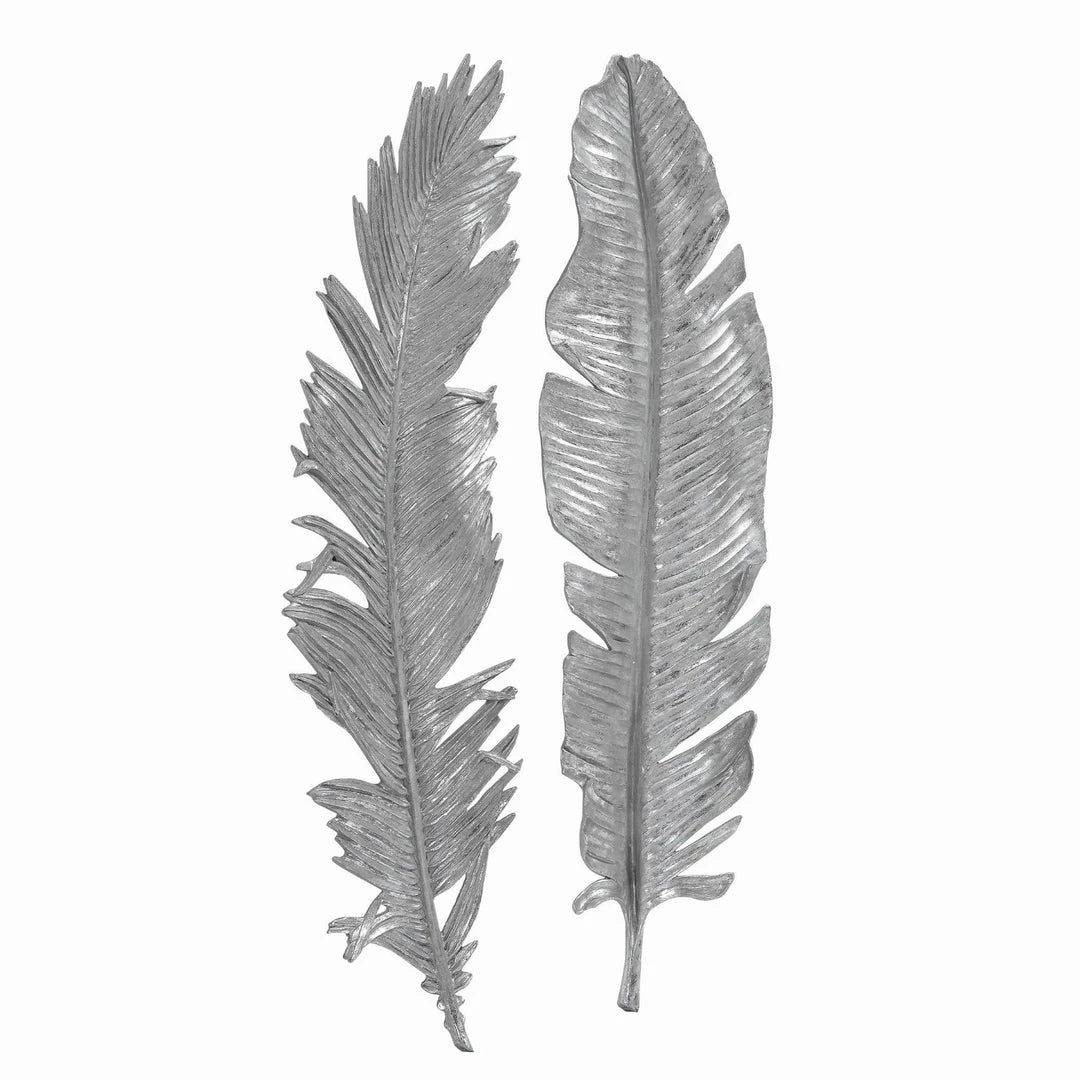 A whimsical set of 3-dimensional cast feathers in hand applied bright metallic silver leaf.