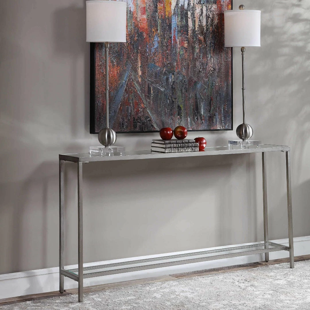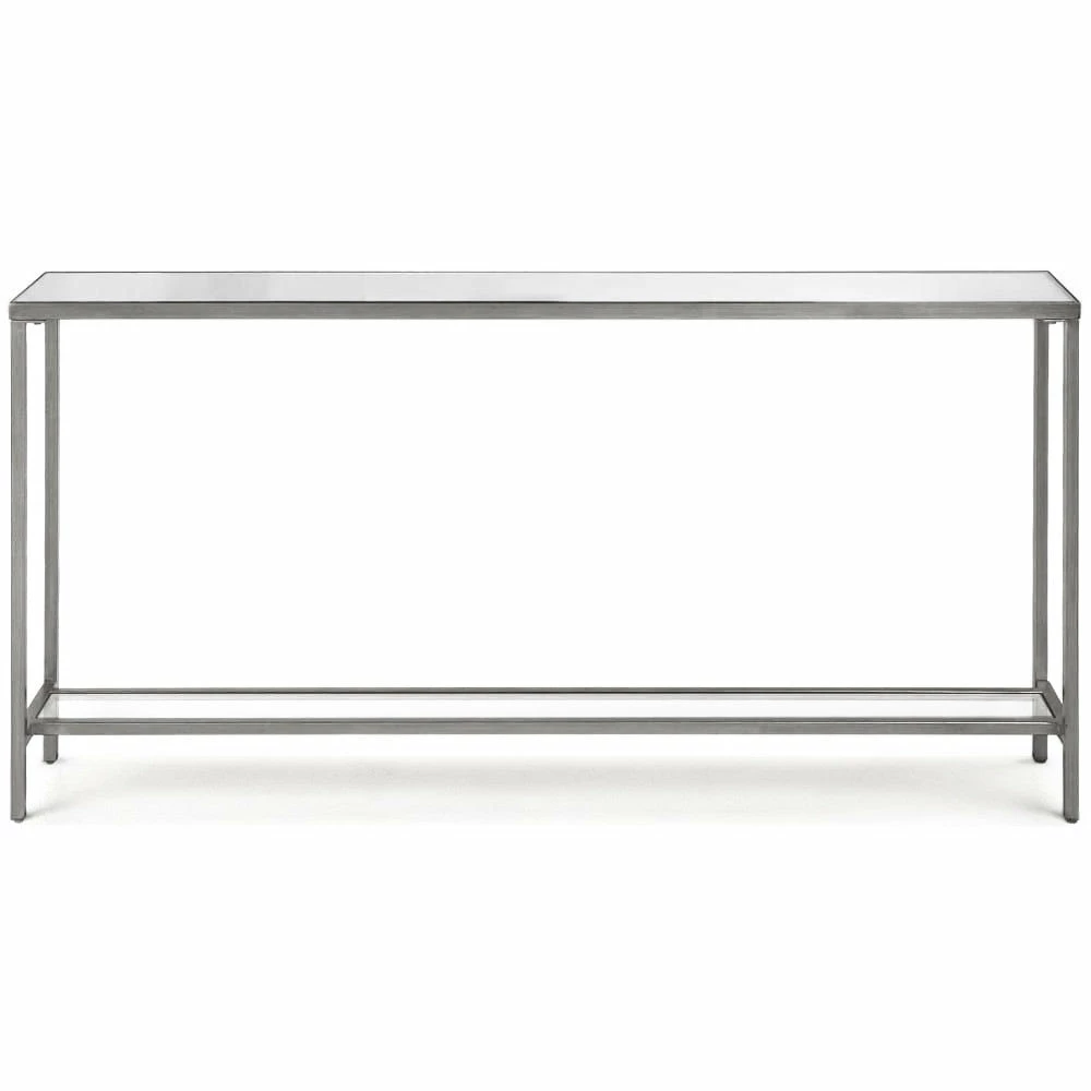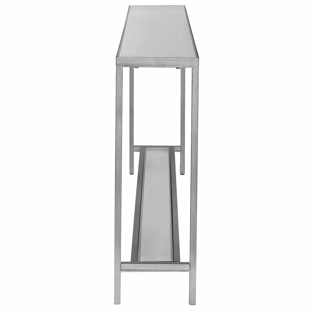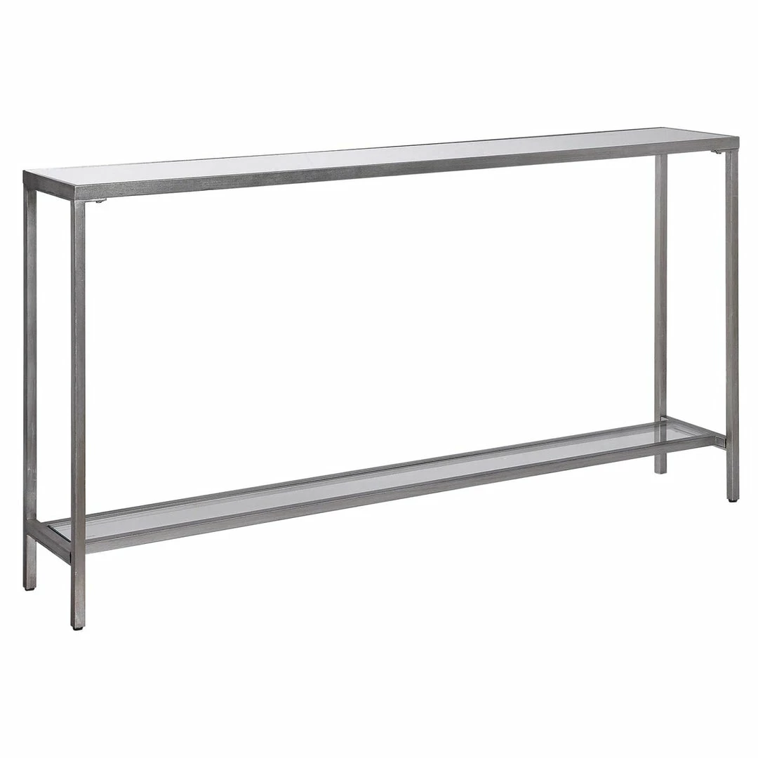 Classic minimalism, this narrow iron console table is finished with lightly antiqued silver leaf, inset with a beveled mirrored top, and gallery shelf in clear glass.