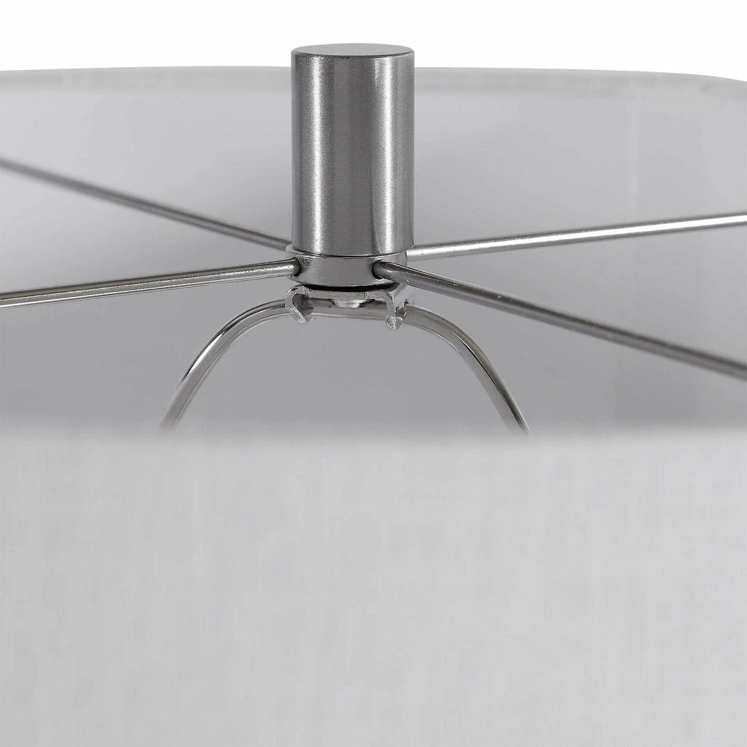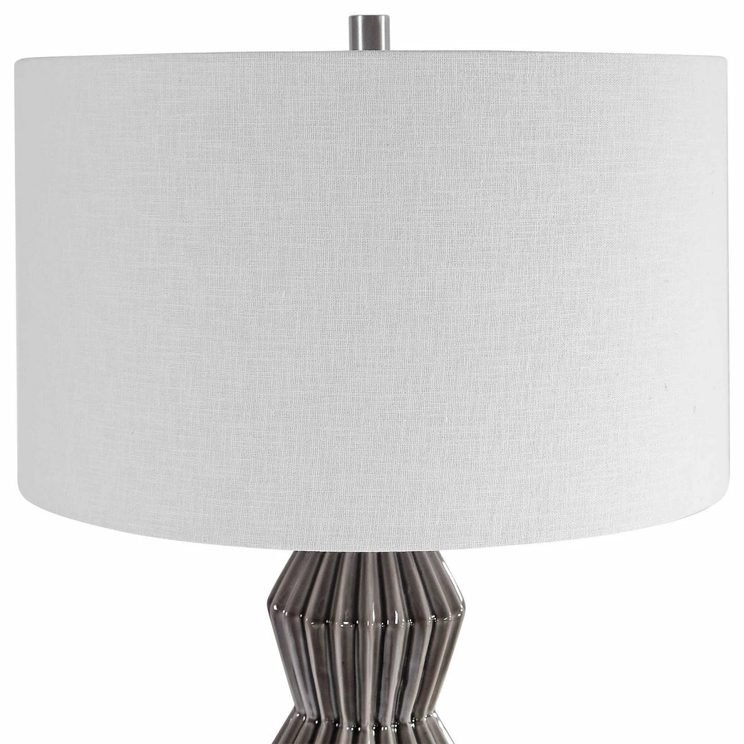 This table lamp features a retro, geometric styled ceramic base finished in a smokey gray glaze with ribbed texture, accented with brushed nickel plated details and a thick crystal foot. The hardback drum shade is a white linen fabric with natural slubbing.