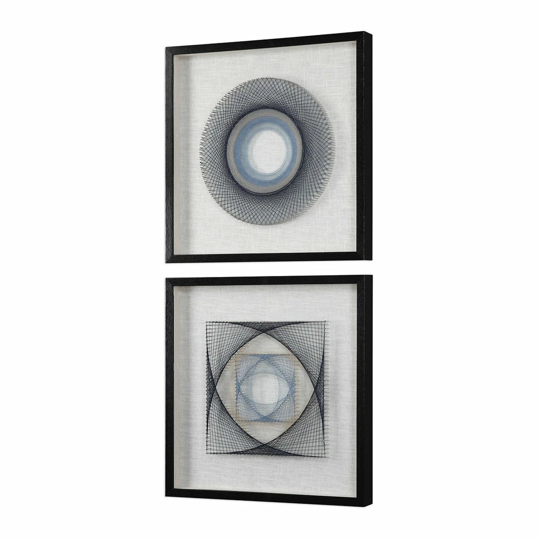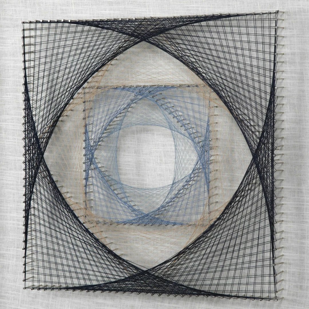 These fun shadow boxes feature 3-dimensional layered string art, hand threaded around individually hammered pin nails in easy shades of blue, over a neutral linen backing with a black pine frame.
