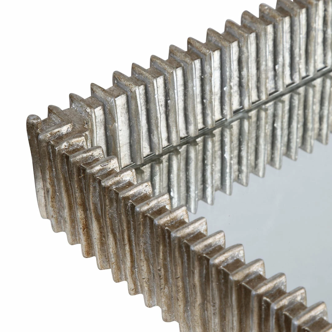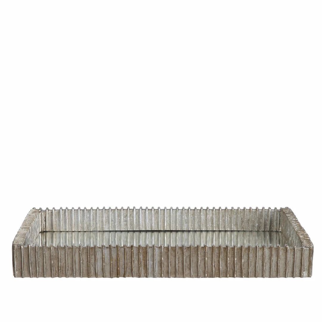 This contemporary tray showcases an organic ribbed texture finished in silver leaf with a mirrored base perfect for reflecting your favorite objects.
