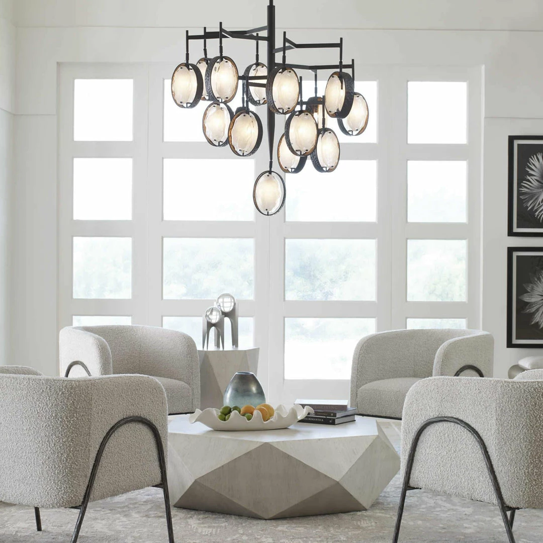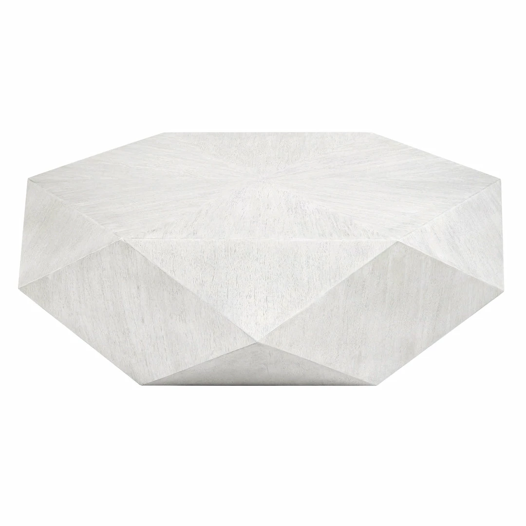 This unique geometric coffee table features a low profile, perfect for viewing the sunburst top in mango veneer in a fresh white ceruse finish.