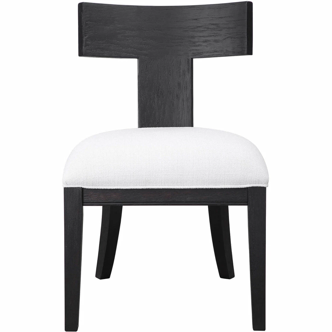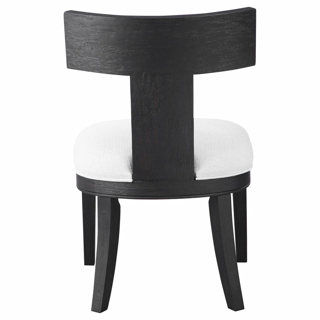 A casual take on a classic design, this klismos style chair features a curved rubber wood frame that has been wire brushed and rubbed in a charcoal black stain, paired with a white slubbed performance fabric cushion.
