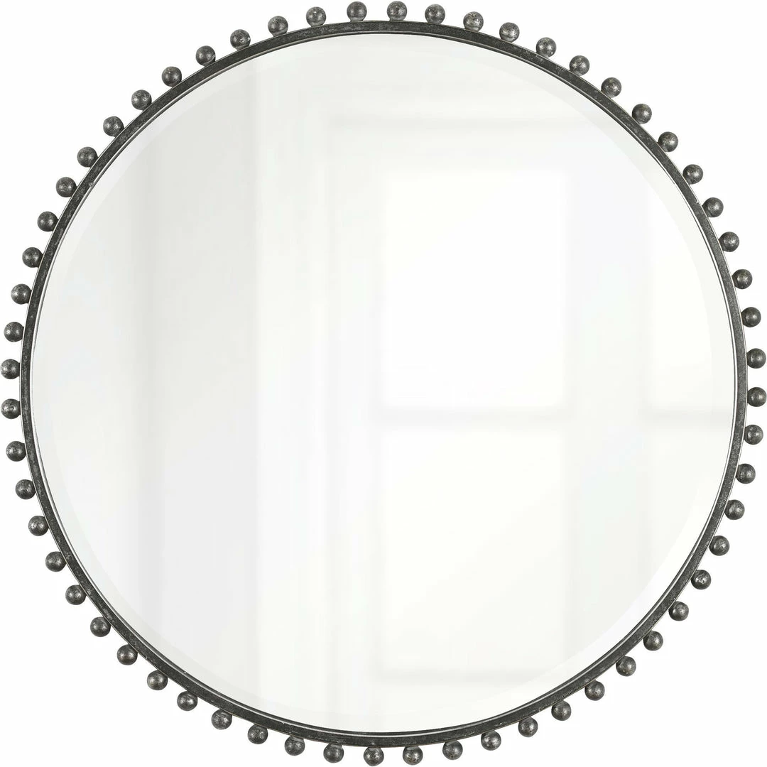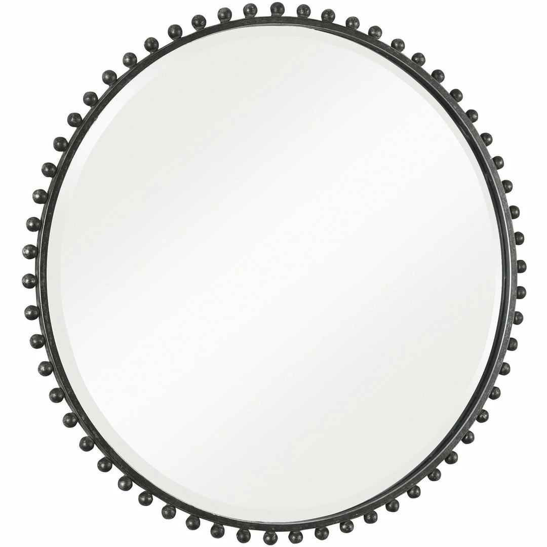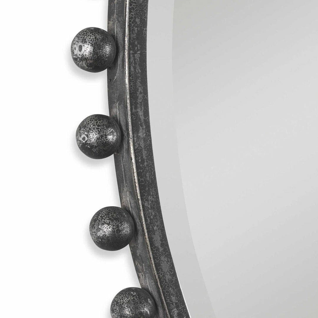Petite iron spheres line the outer edge of this round frame, finished in a distressed black with silver highlights and a light gray glaze. Mirror features a generous 1 1/4″ bevel.