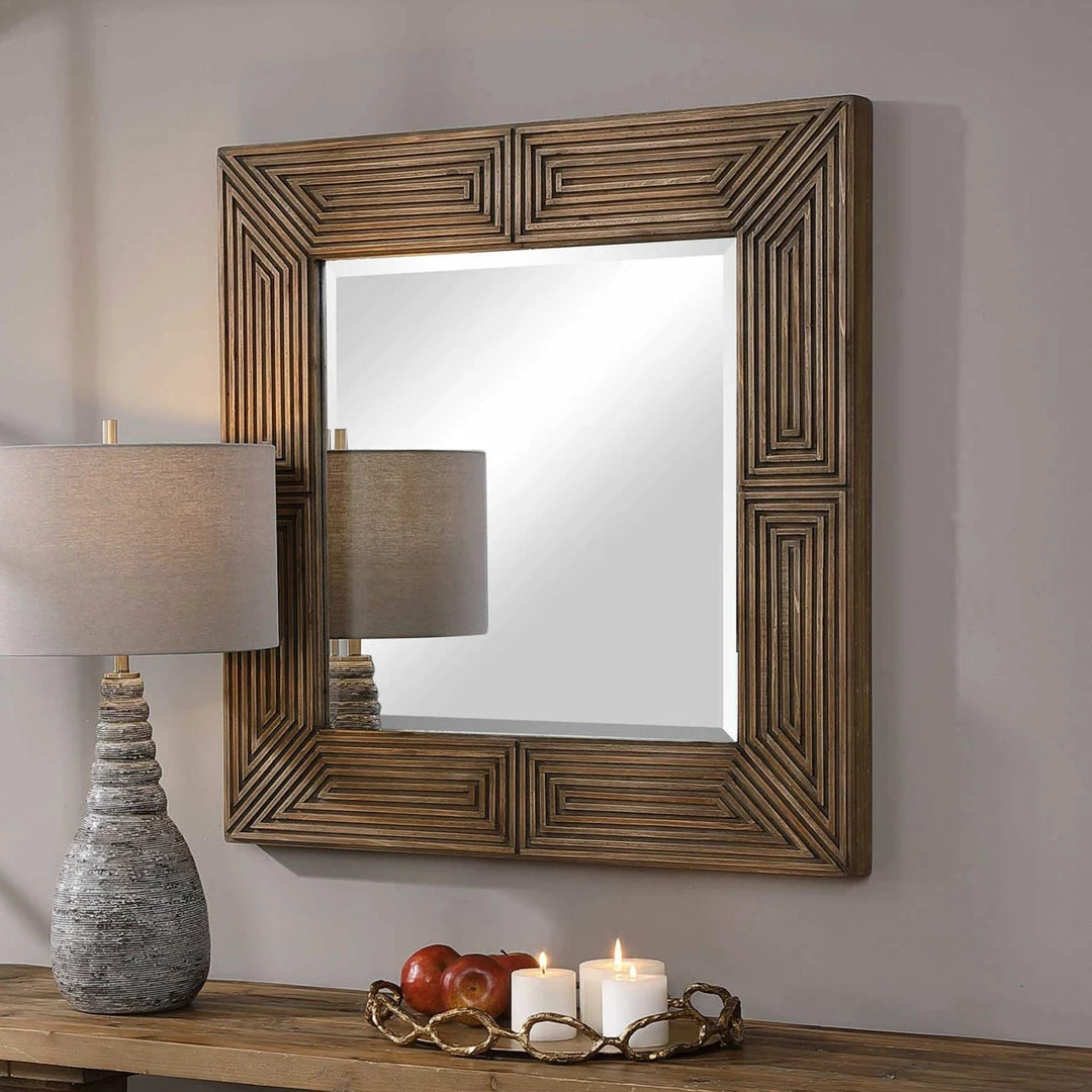 Inspired by world travels and collected pieces, this square mirror showcases intricate hand carved details that create unique geometric patterns. The aged chestnut stain finished frame highlights a beveled center mirror.