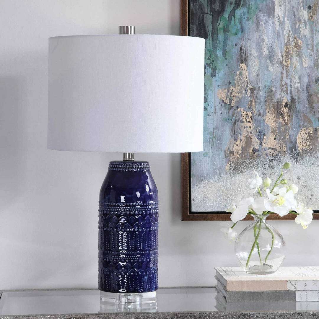 This ceramic table lamp is finished in a distressed deep blue glaze features an embossed tribal design displayed on a thick crystal foot accented with brushed nickel details. The lamp is complimented by a white fabric drum shade.