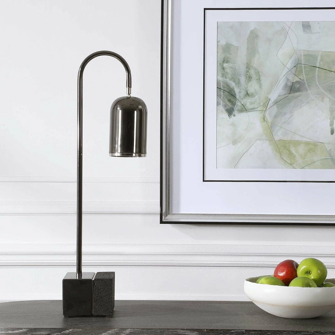 Contemporary style desk lamp showcases a sleek steel base finished in a plated black nickel with a matching metal shade and polished nickel accents. The block foot is a combination of black lava stone and black marble with subtle white veining and beveled edges.