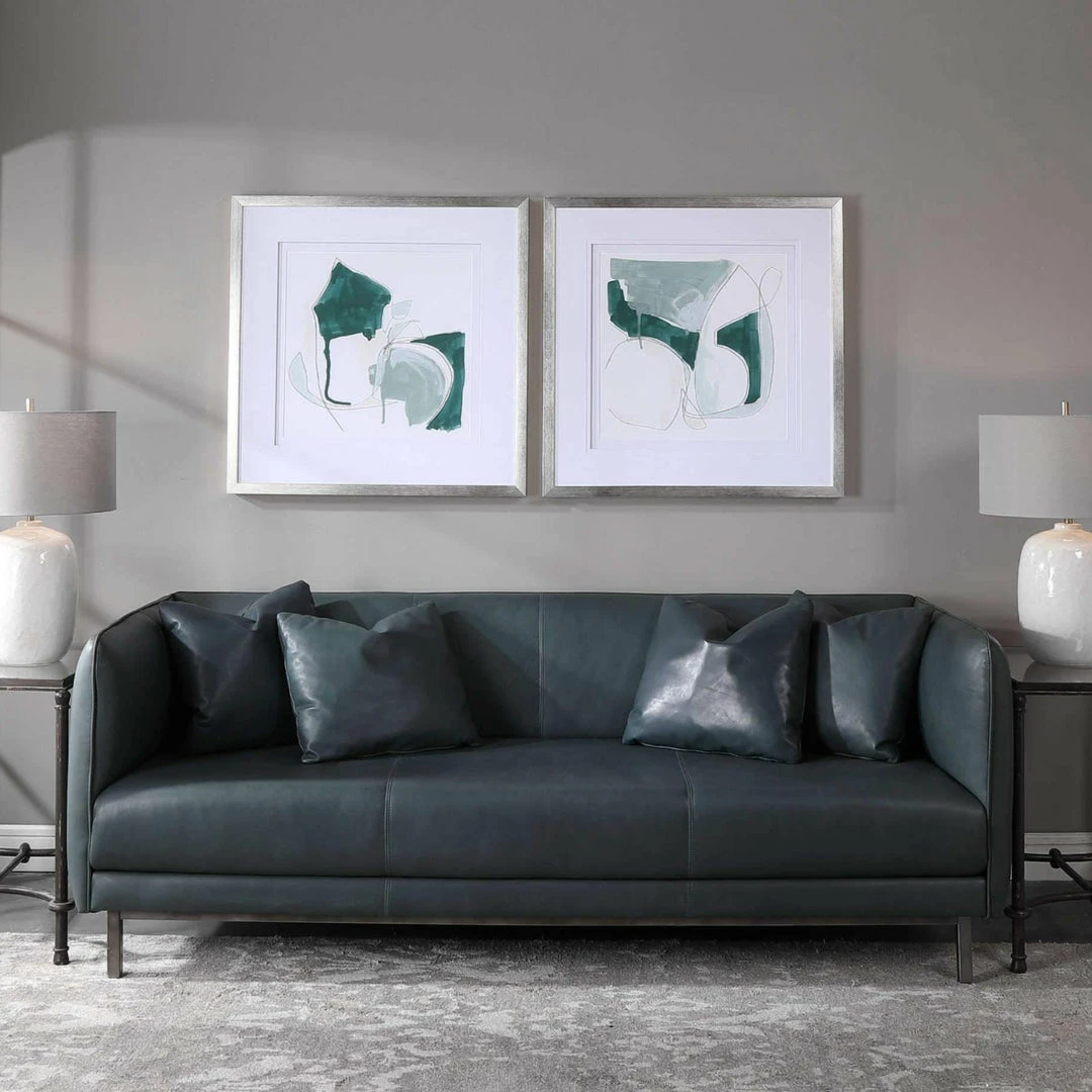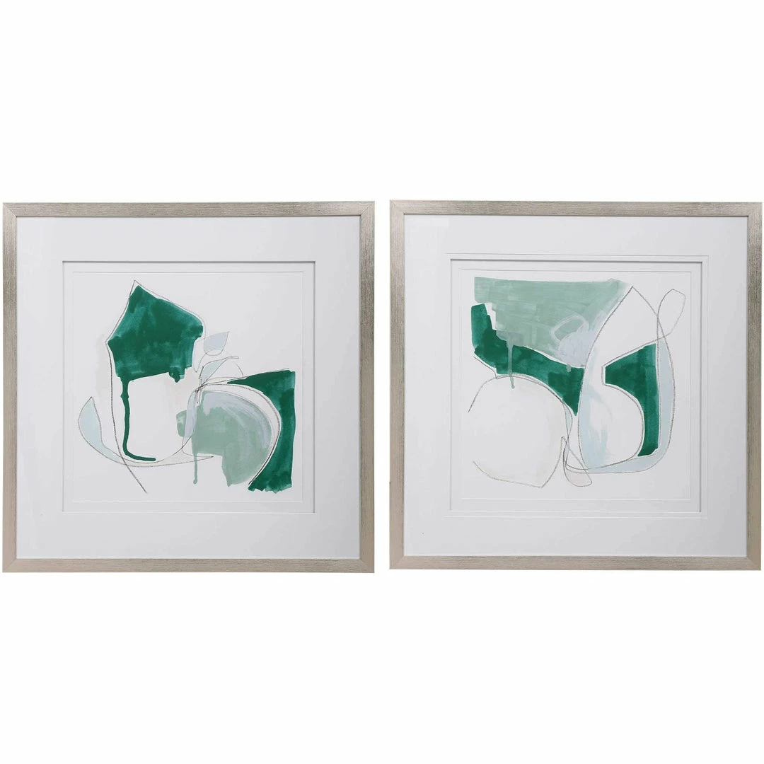 This pair of modern abstract prints on artistry paper showcases a deep teal green hues on white. Triple matting and a bushed silver frame complete each print under glass.