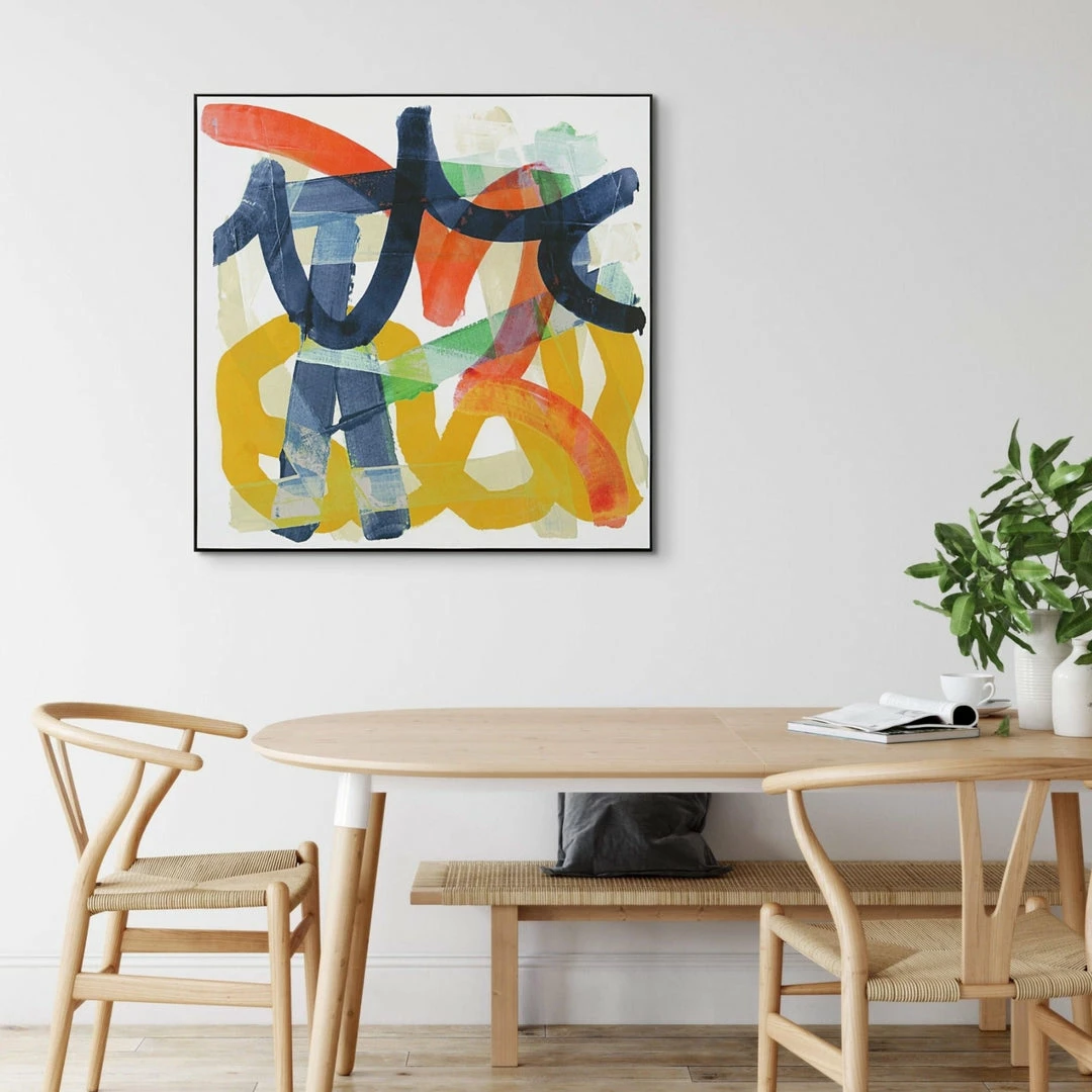 This framed graffiti print is a true work of modern art. The print displays a multitude of abstract channels in bright pops of mustard, lime, navy, and denim accented by a petite jet black metal frame.