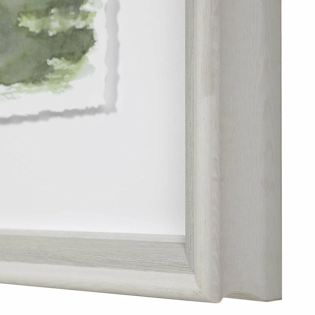 Inspired by the beautiful scenery of Yosemite National Park, these watercolor style prints showcase striking hues of green and blue with delicate hand torn edges. Each landscape is accented by a white background and an off-white frame under glass. Artwork by Ethan Harper.