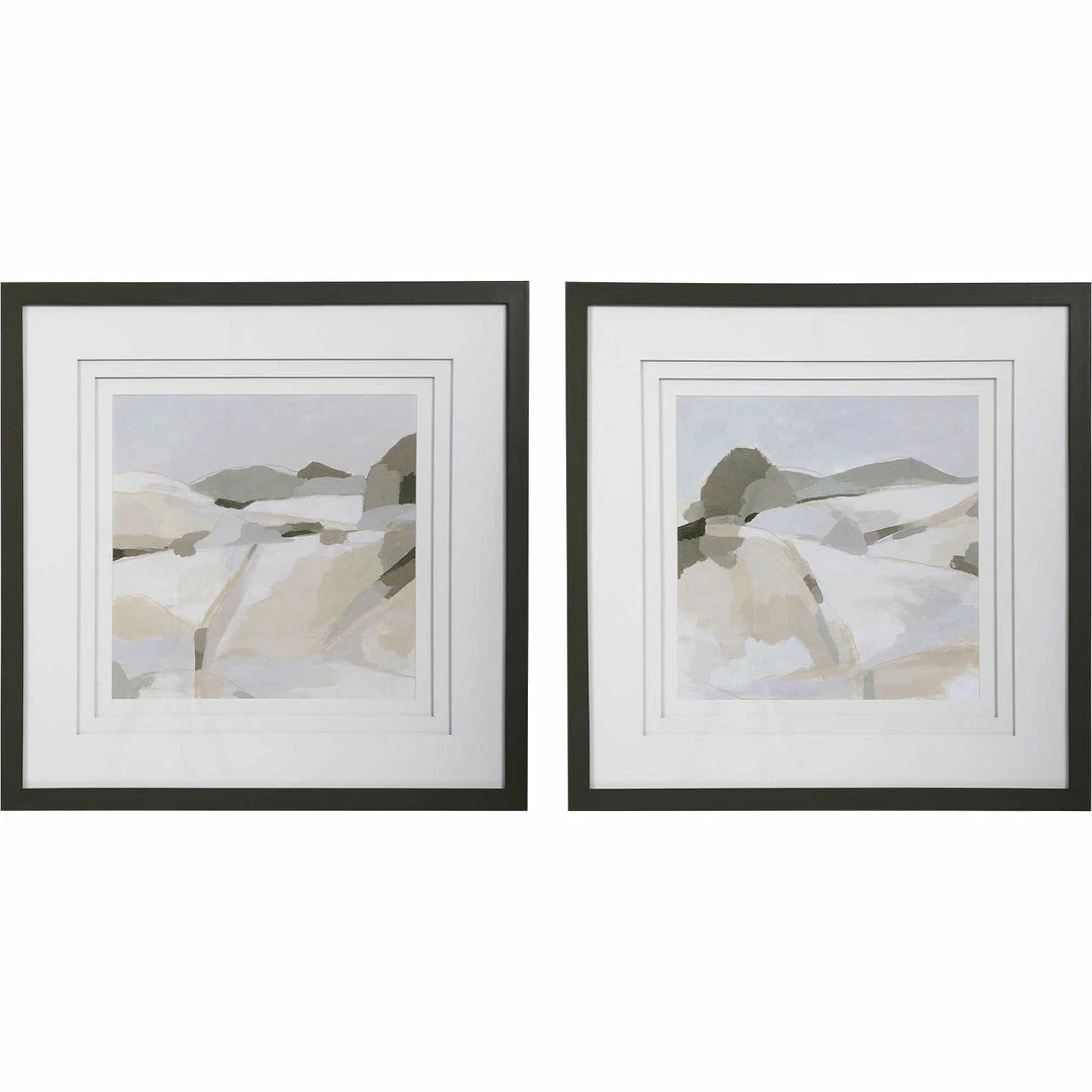 A modern interpretation of the Rocky Mountains, these framed prints showcase an array of neutral shades including taupe, brown, light gray, and white. Each print is accented by triple white matting with spacers and a sleek slate gray frame.