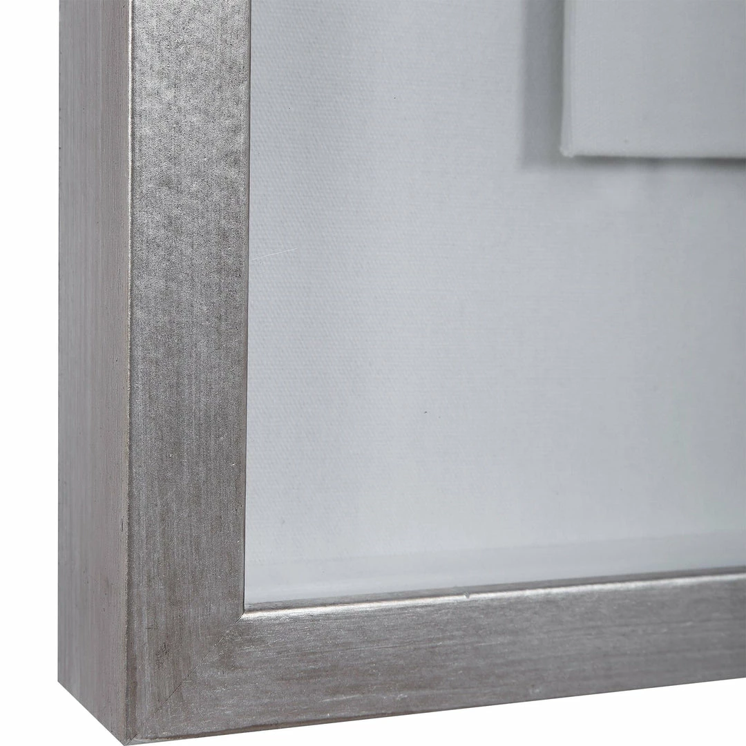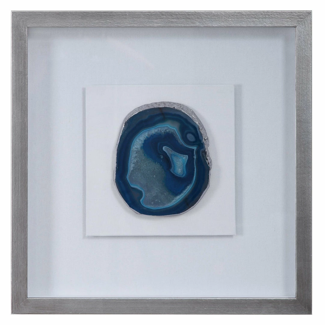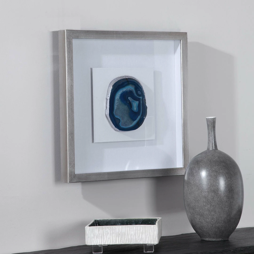 A pine wood shadow box featuring a hand applied silver leaf finish showcases a striking blue agate stone with light blue veining, accented with hand painted silver edging. Mounted on a white linen backing.