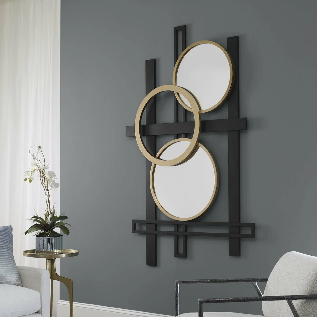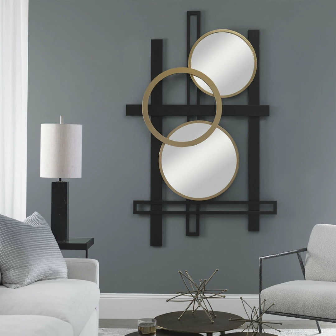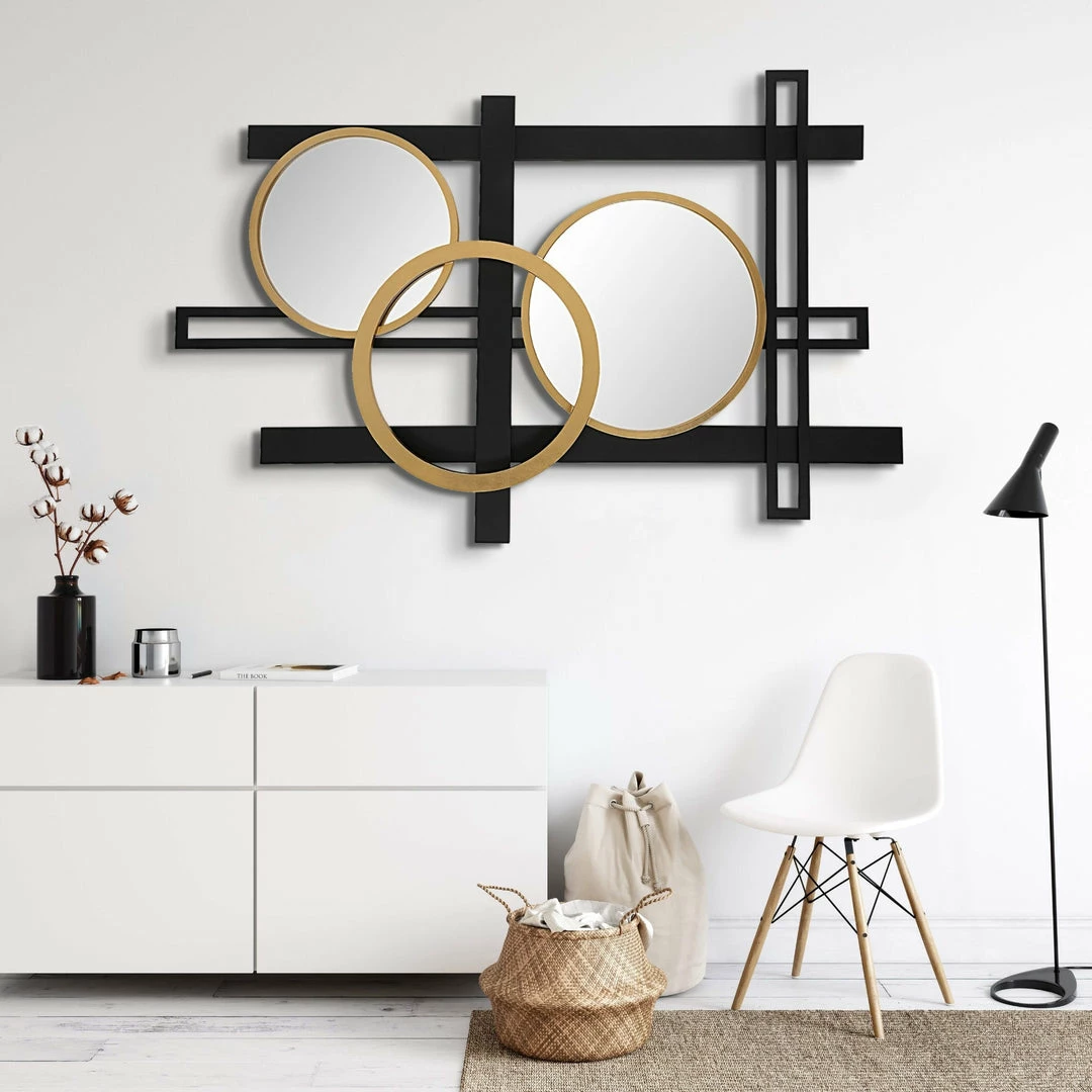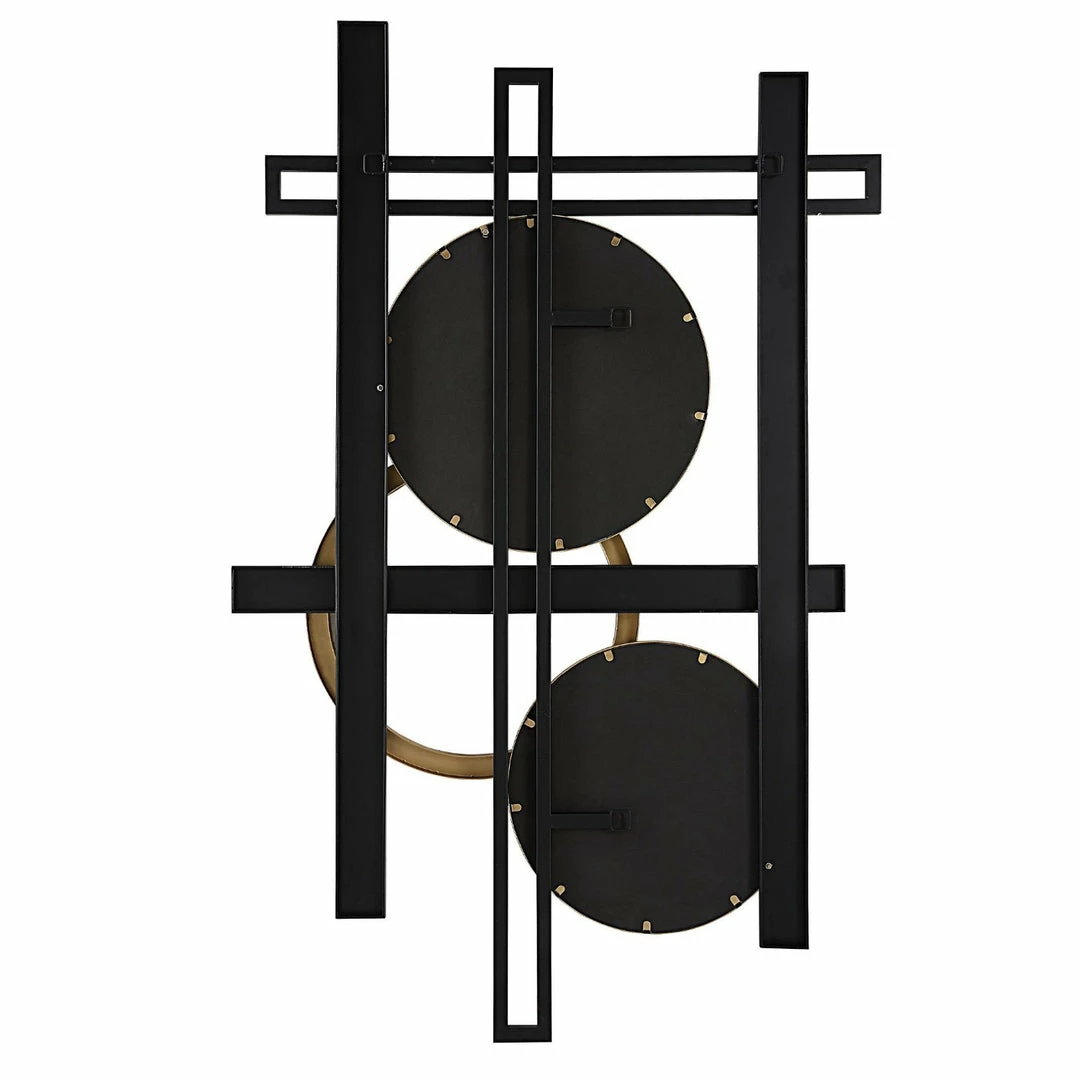 Contemporary metal wall panel displays a layered geometric design with mirrored accents, finished in matte black and antique gold.
