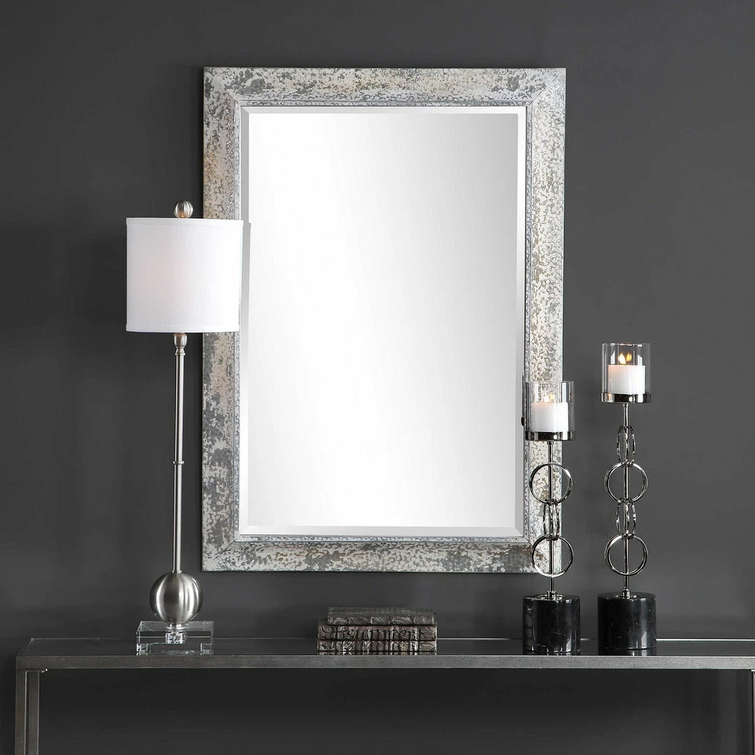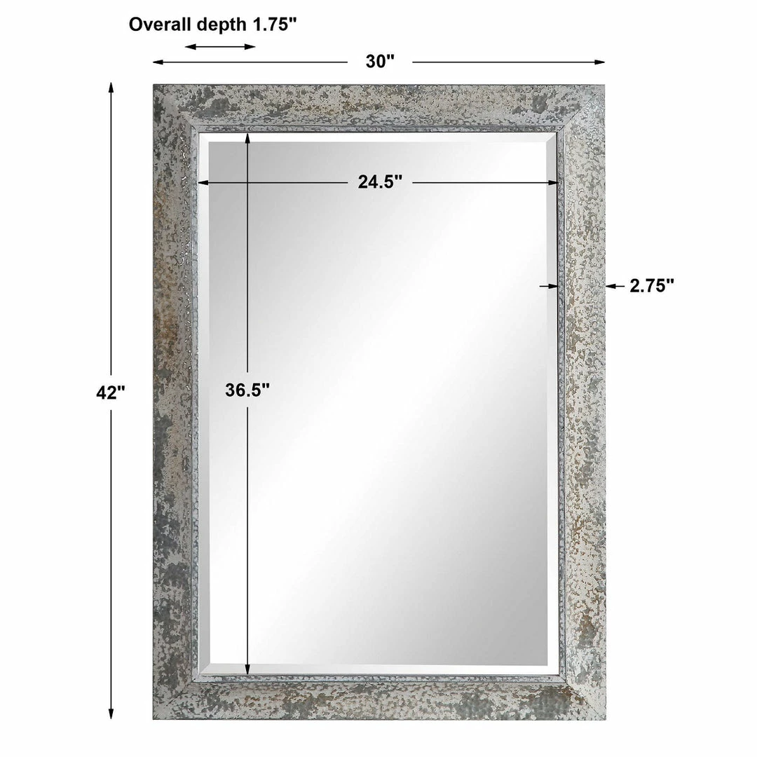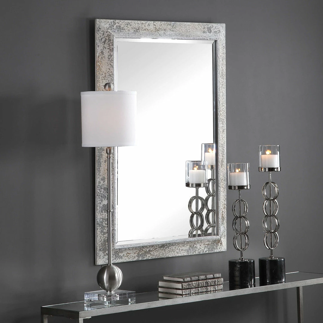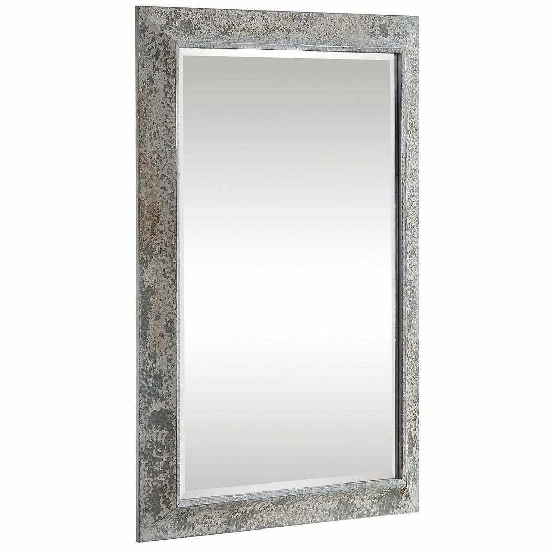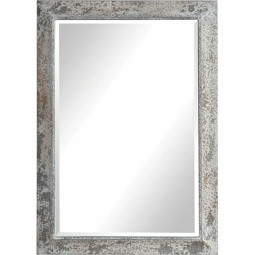 This mirror showcases a rustic casual style. The aged silver frame features an antique ivory wash with rust accents, heavy texture, and distressing. The mirror has a generous 1 1/4″ bevel