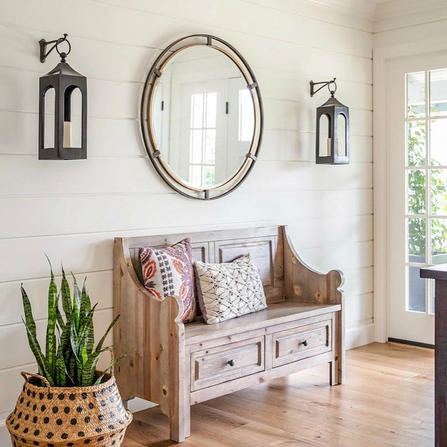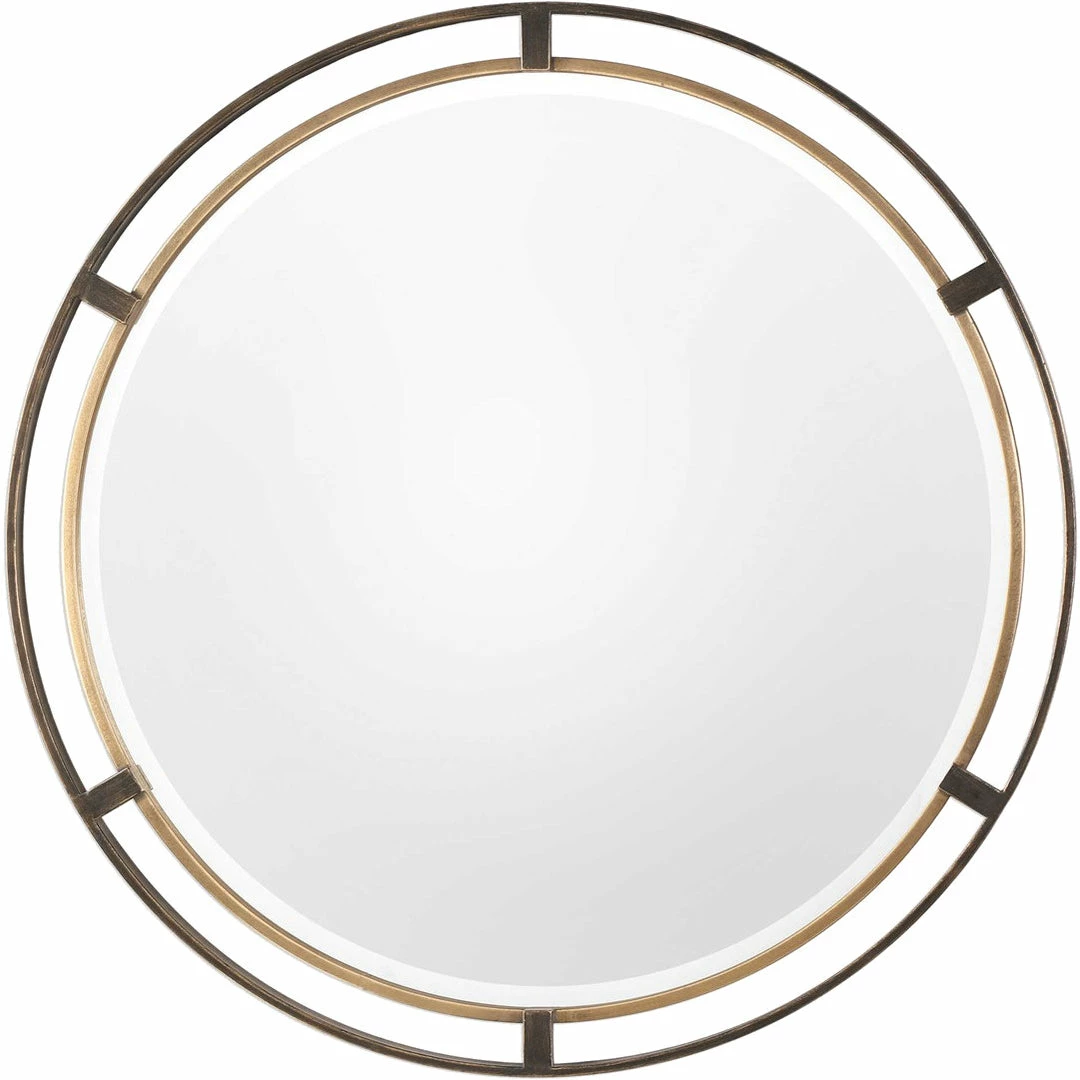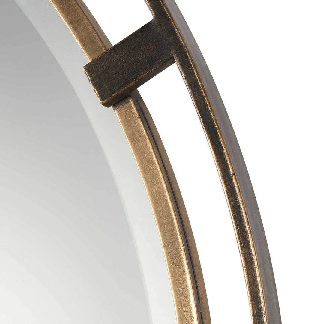 This iron frame features a 3-dimensional design with an outer overlapping frame finished in a distressed rustic bronze, accented with a lightly antiqued gold center. Mirror features a generous 1 1/4″ bevel.