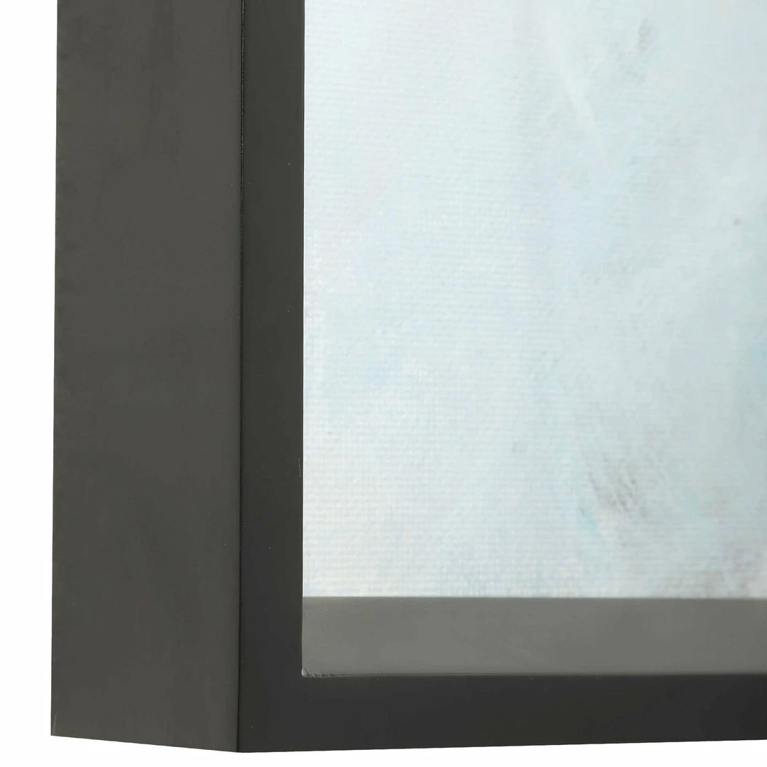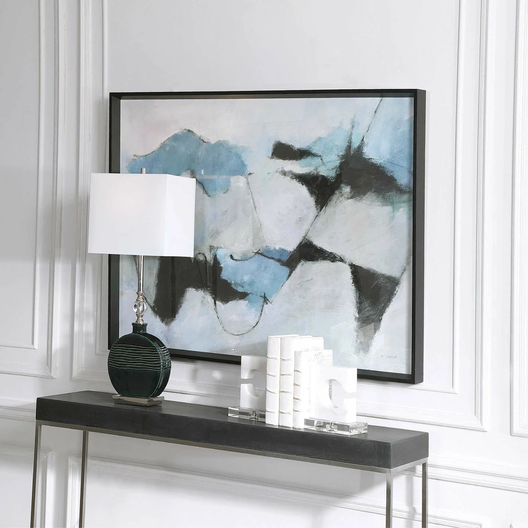 This modern abstract artwork showcases a blend of contemporary styles with a masculine feel. The print is comprised of cornflower blue, black, light gray and white tones and is accented by a simple matte black pine wood frame under glass.
