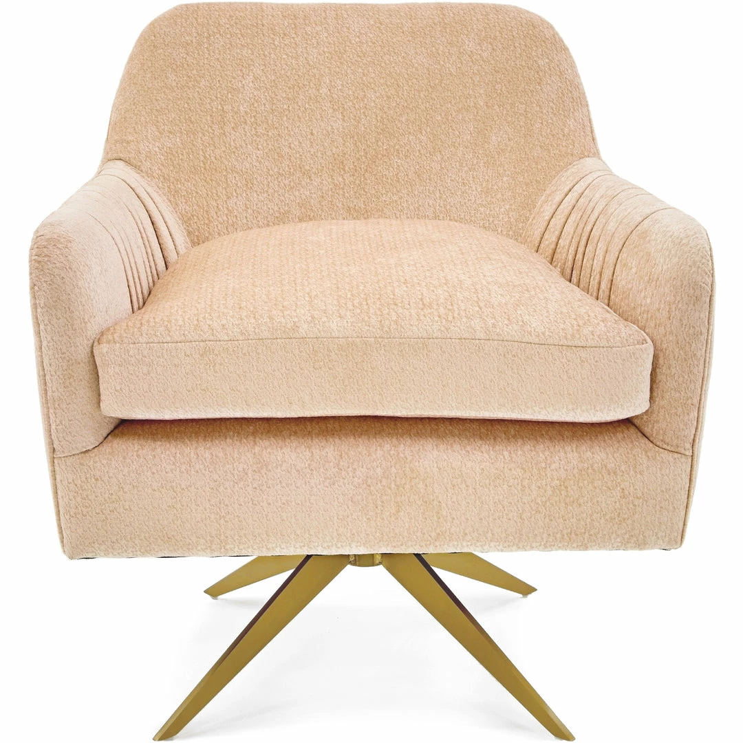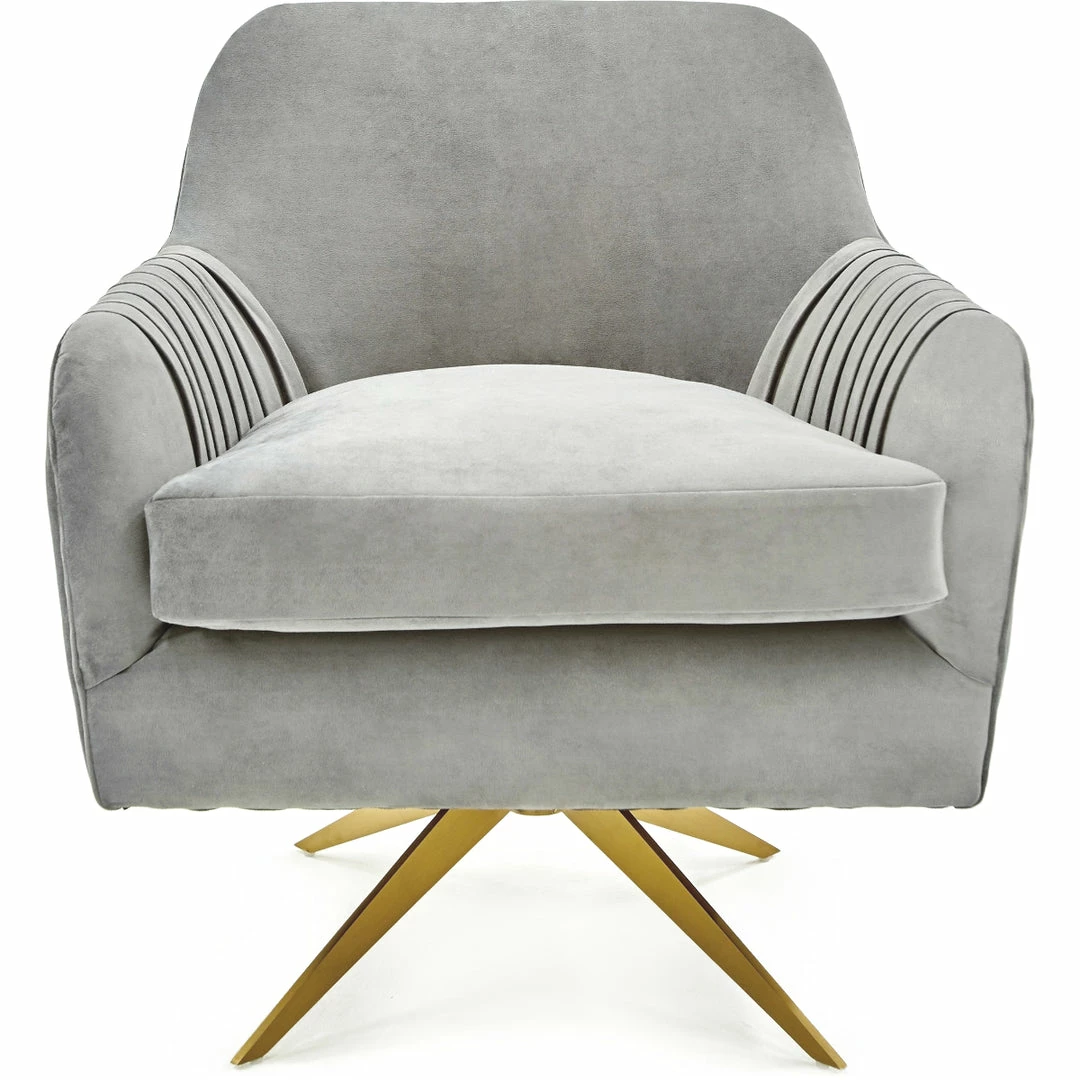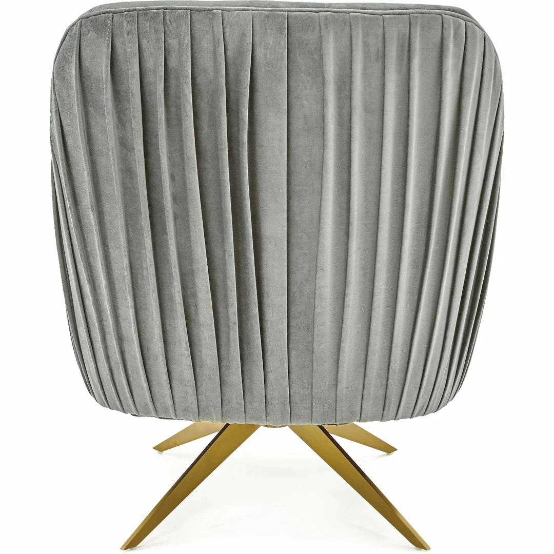 With a gold metal base, upholstered in your choice of gray or textured peach velvet fabric, this swivel chair’s pleating on the back gives it extra charm.