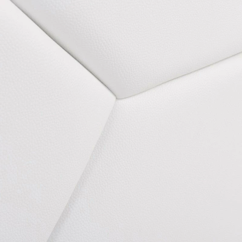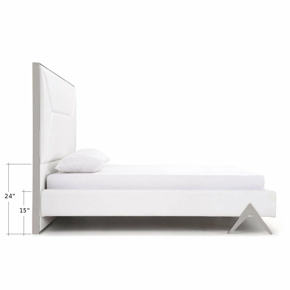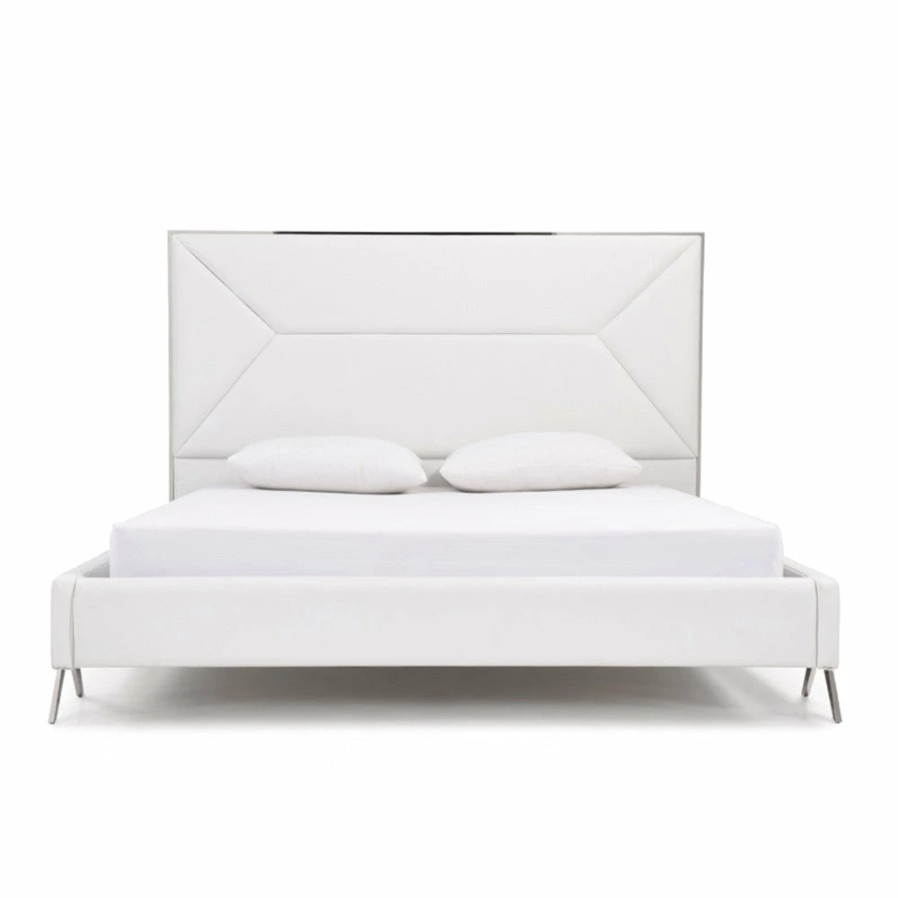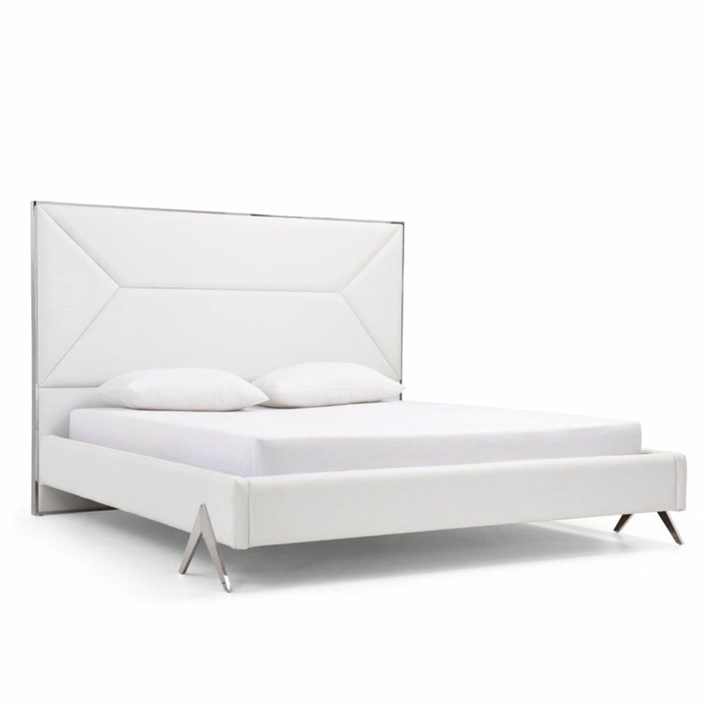 Upholstered in white leatherette, the headboard of the Lexi Bed has a stitched geometric design and a stainless steel border that goes all the way to the floor. The complimenting boomerang shaped legs finish off this modern minimalist bed design.