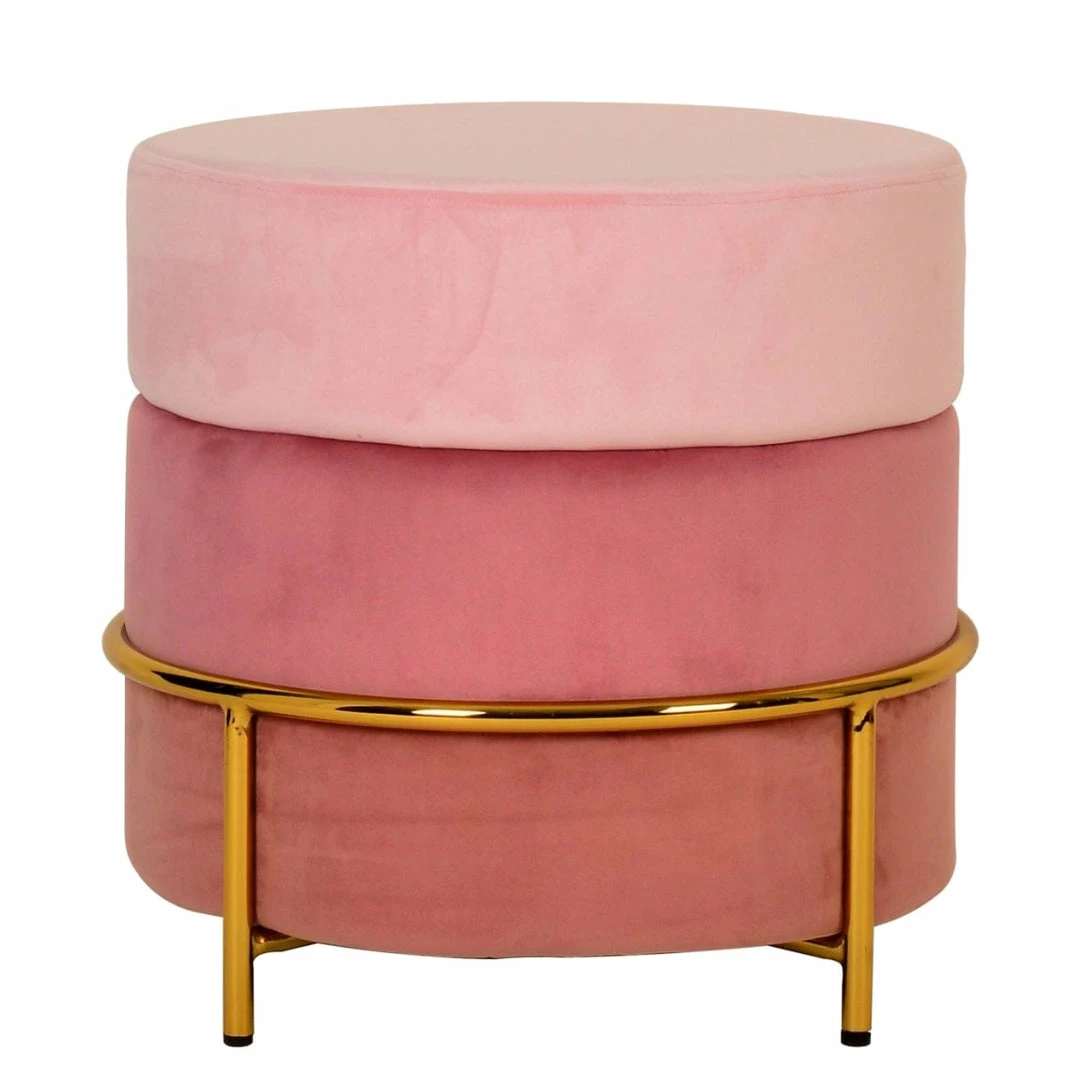 This petite ottoman is covered in hues of pink and coral velvet upholstery and set within a gold metal base.