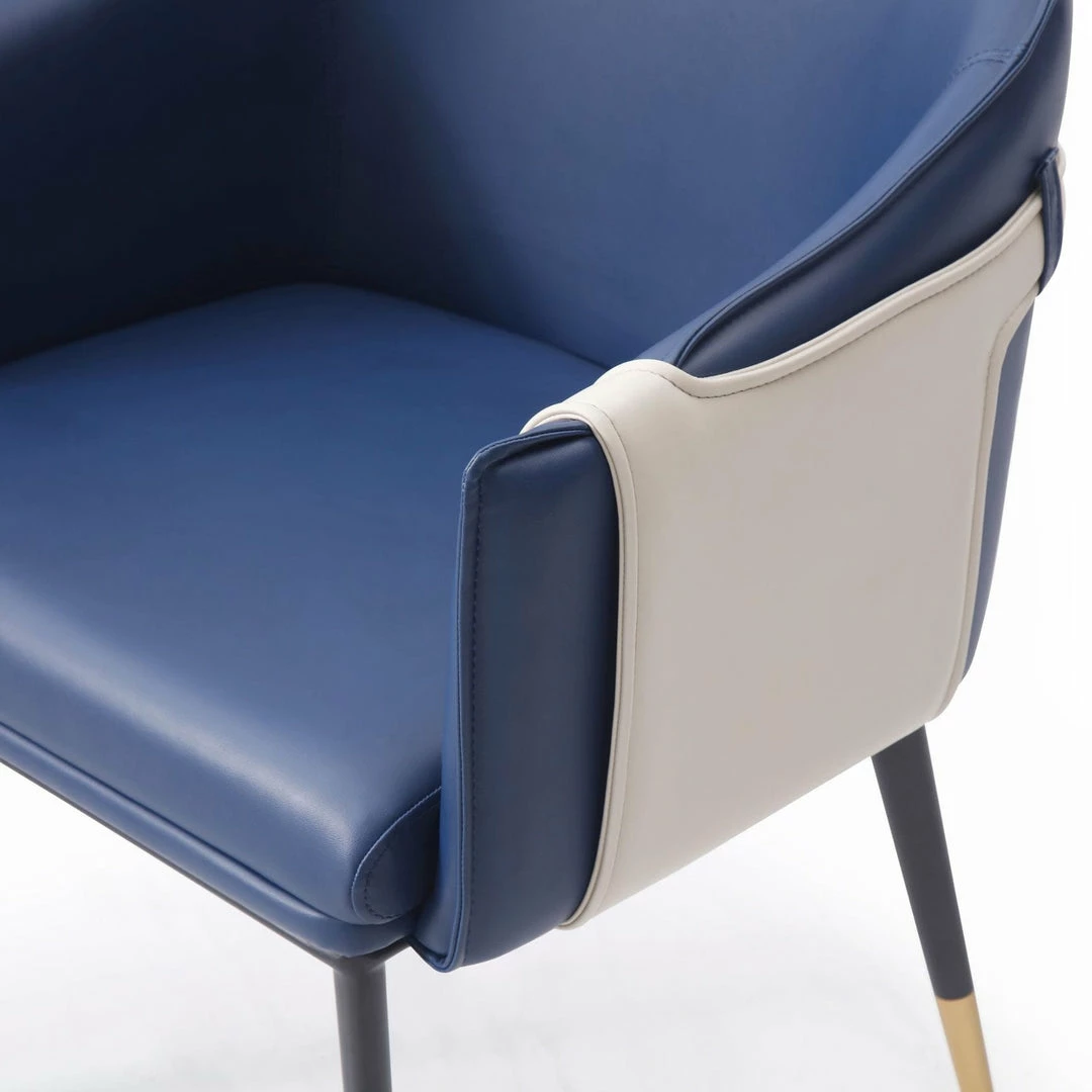 A sporty take on a barrel design. Covered in leatherette, Shelby’s stylish blue curves are layered and belted in beige and set on gold tipped black metal legs to create a fun, attention worthy seat.