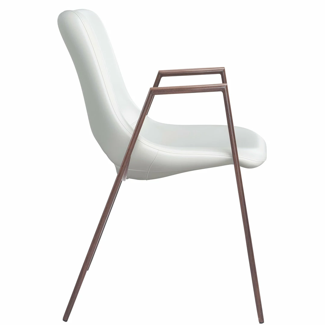 The Desi Chair has mid century modern urban lines and looks great in any space. The heavy duty vinyl leatherette covering and sturdy walnut veneer coated steel frame is durable for both residential and hospitality use.