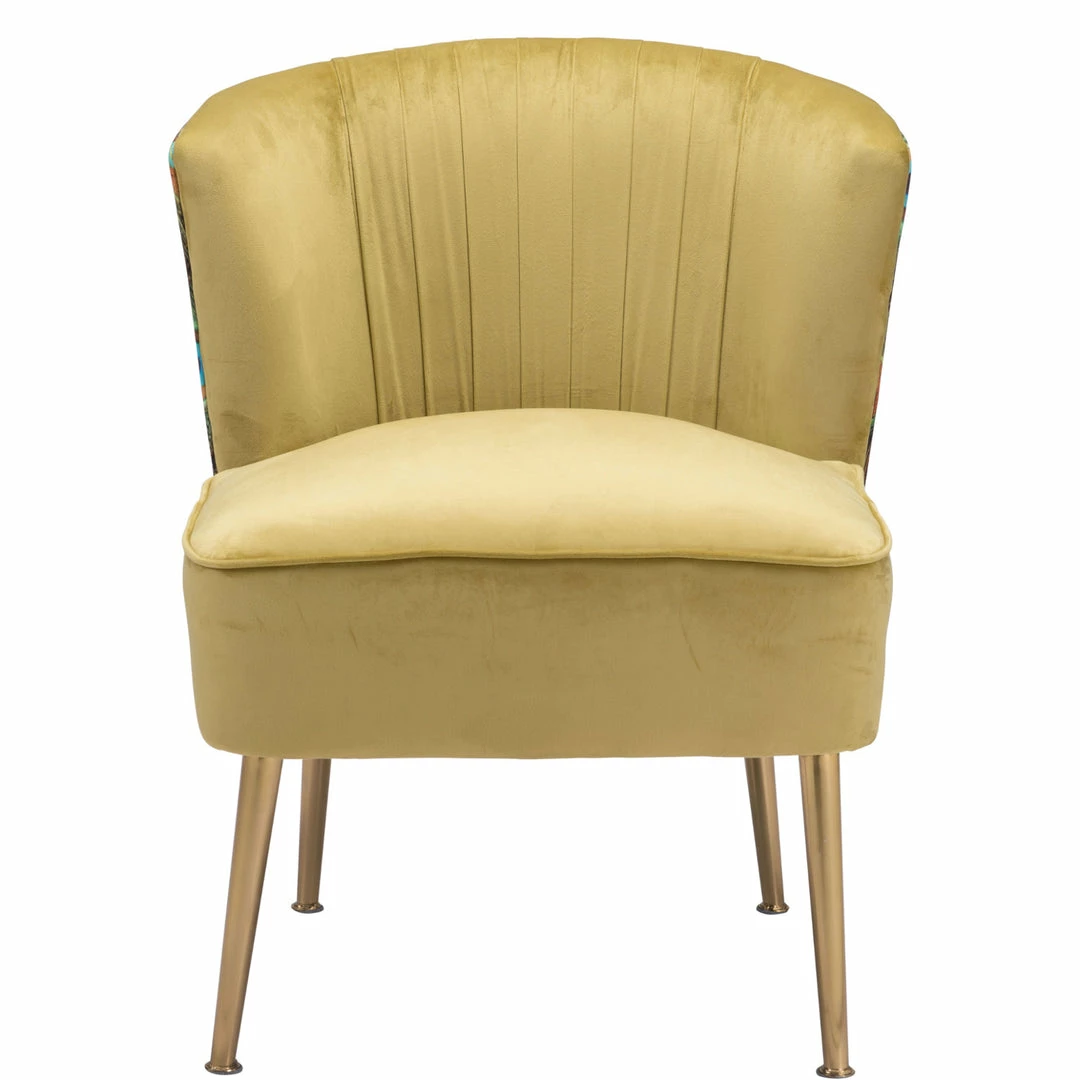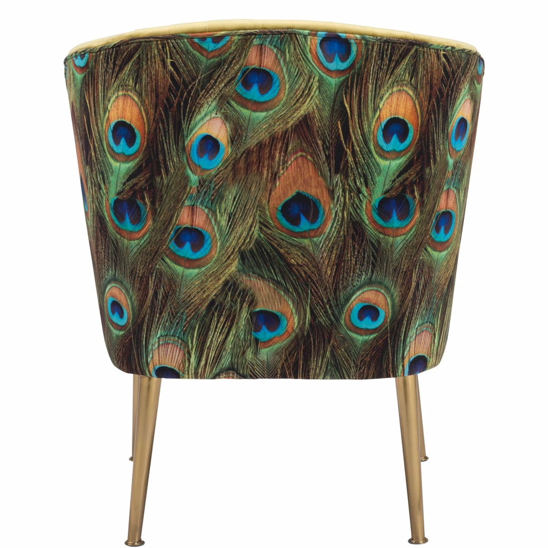 Upholstered in soft gold velvet upholstery, this petite seat brings statement-making bohemian style with its peacock feather pattern printed back.