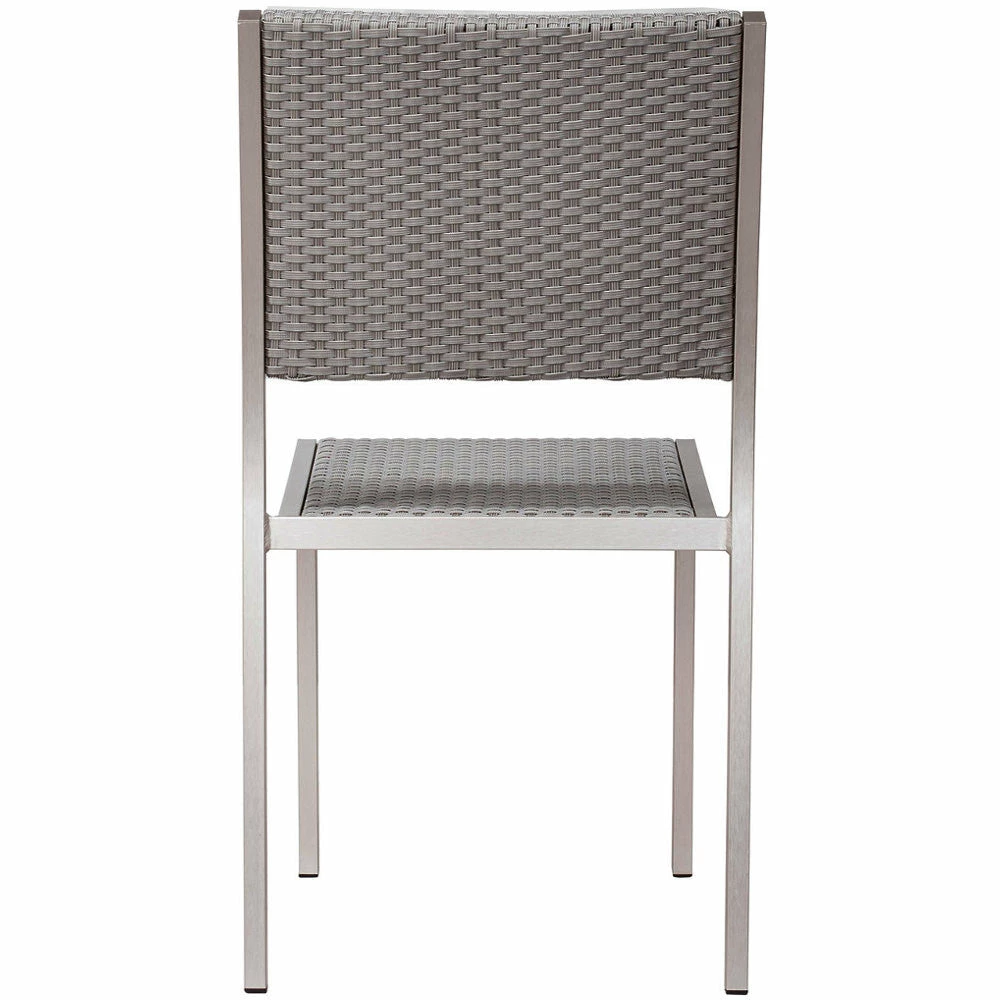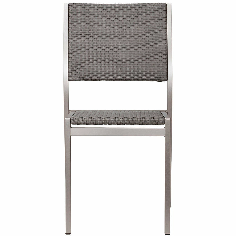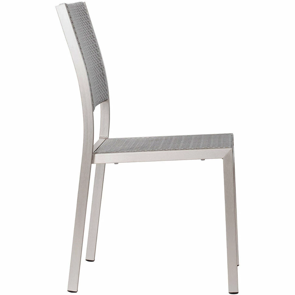 The Minimalist Dining Chair has clean, simple bones. The frame is brushed aluminum with a textile seat and back. Stackable for easy storage.